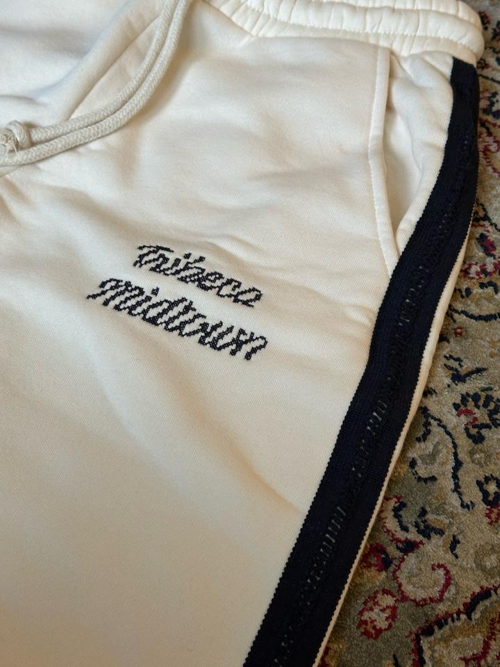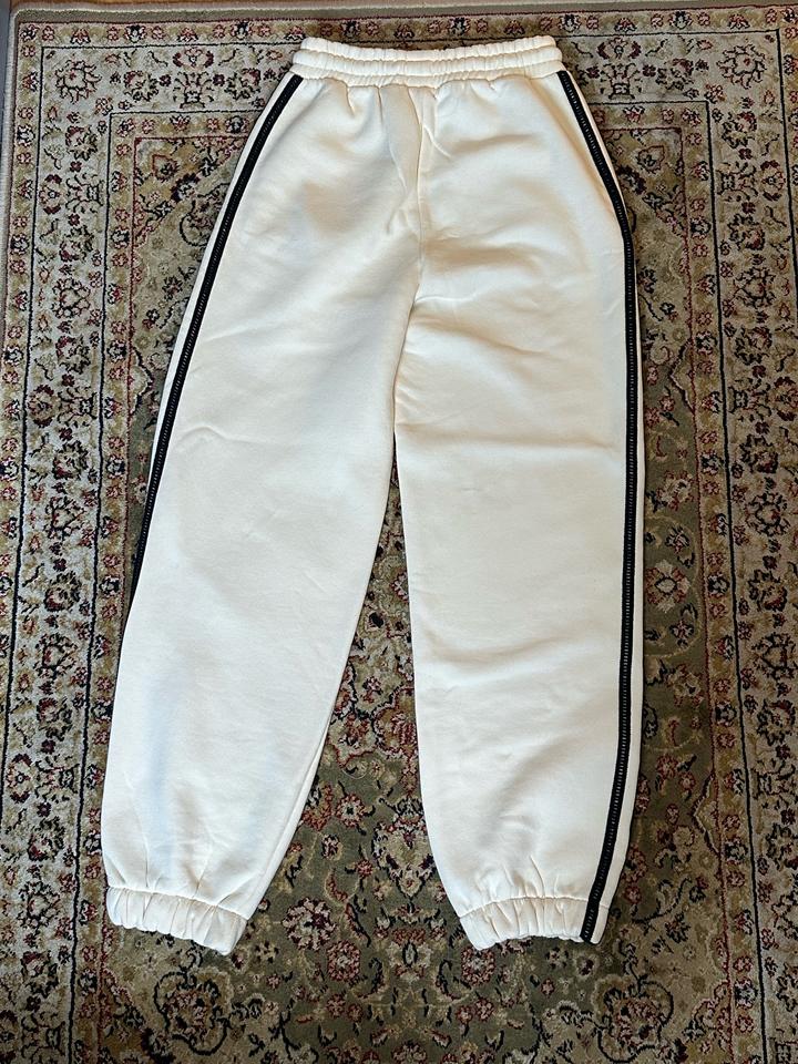 Спортивные белые штаны Zara на флисе. Сбоку есть вставки, и надпись, темно синего цвета Артикул: 529847