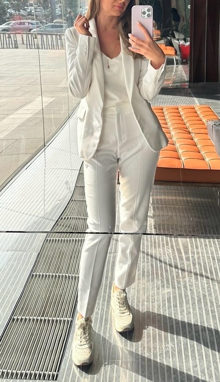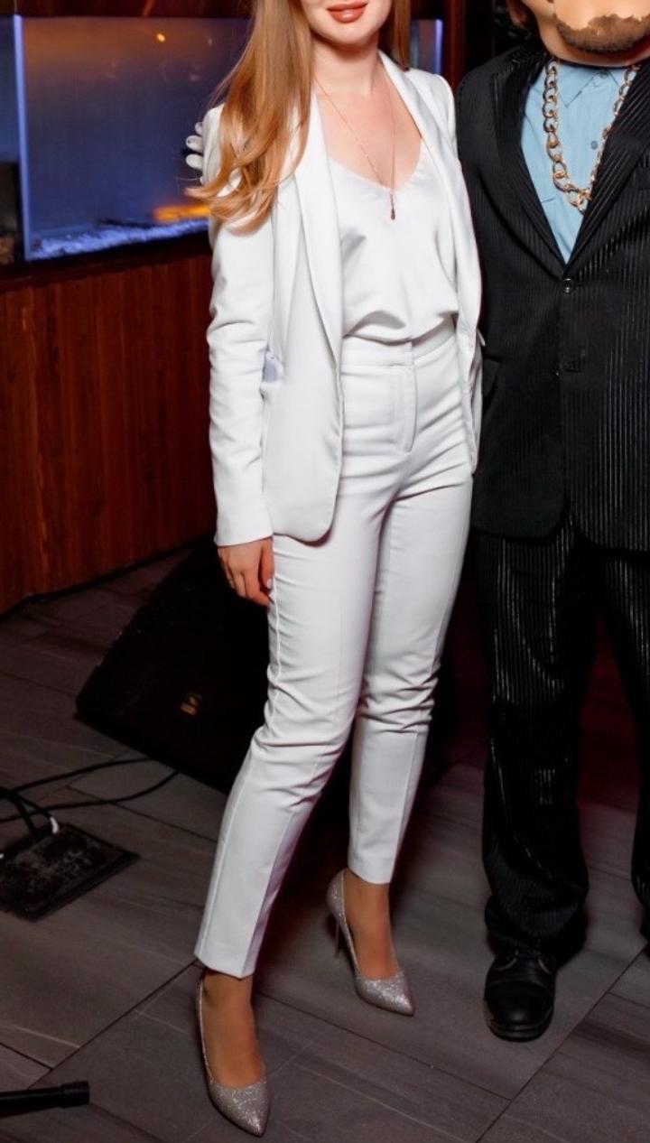 Костюм ZARA Пиджак-смокинг с атласным воротником, брюки на высокой посадке. Белый цвет. Размер XS. Артикул: 530028