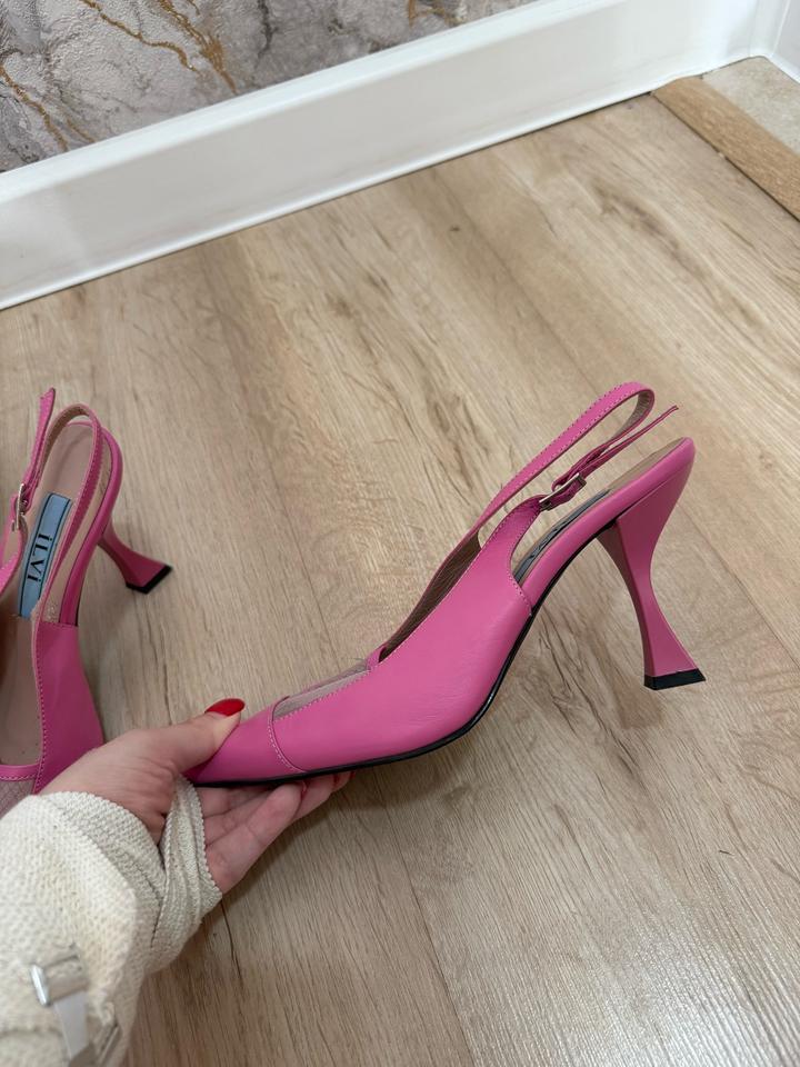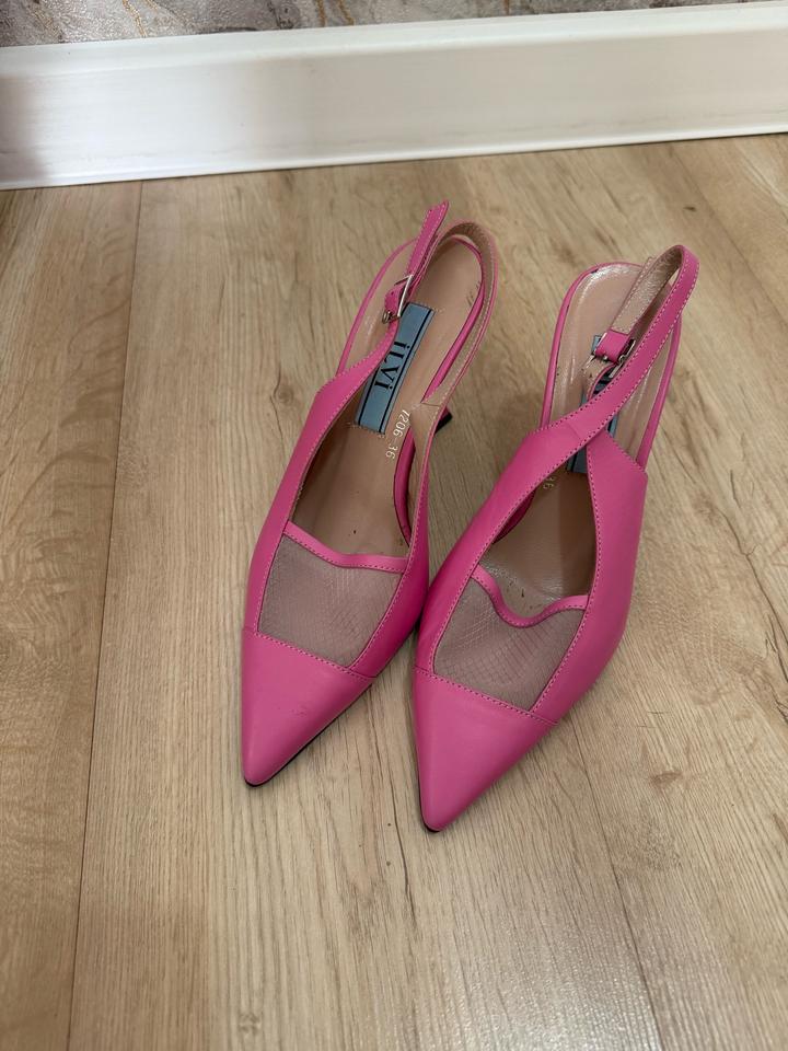Цвет не передает на фото, в живую не настолько насыщенный , более нежнее. В отличном состоянии, натур.кожа, одевала 2 раза на мероприятие. Сейчас маленькие стали. Артикул: 530053