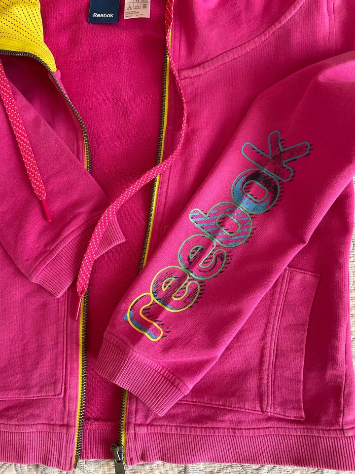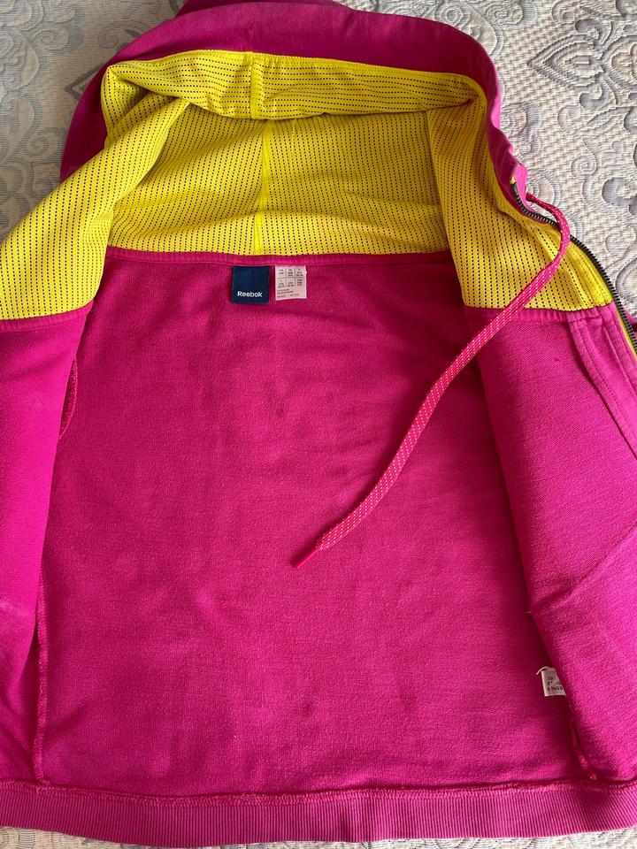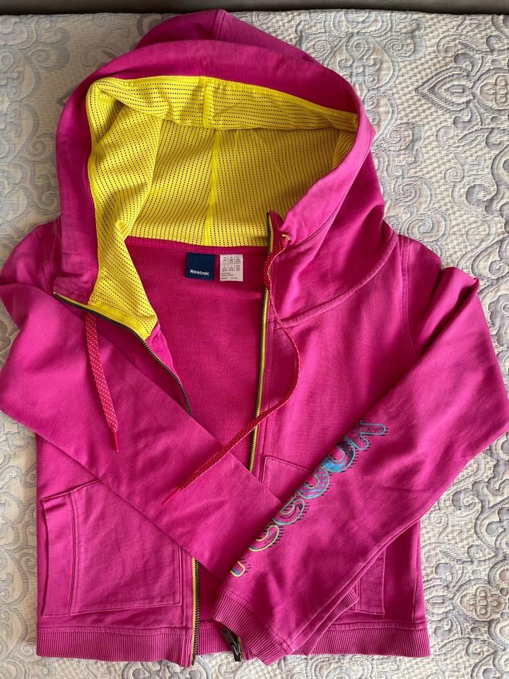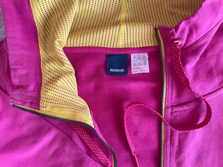 Спортивная кофта на молнии с капюшоном от Reebok. Цвет - насыщенный розовый / фуксия. Подойдет для худенькой девушки или девушки-подростка. Артикул: 530094