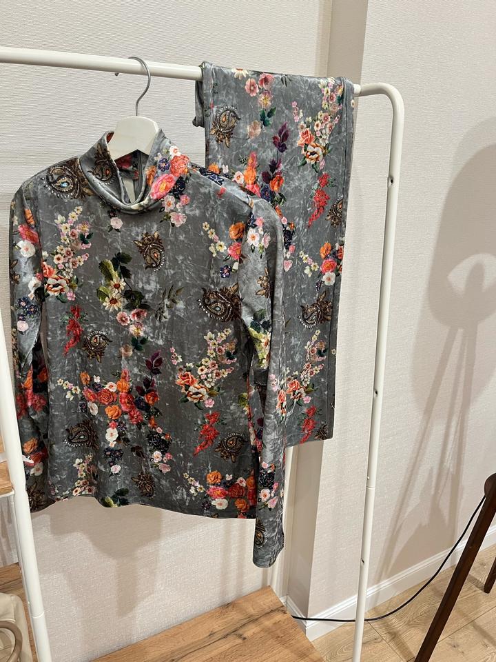 Элегантный комплект в благородном сером цвете с ярким цветочным принтом и изящными восточными элементами. Смотрится очень эффектно и дорого. Артикул: 530136