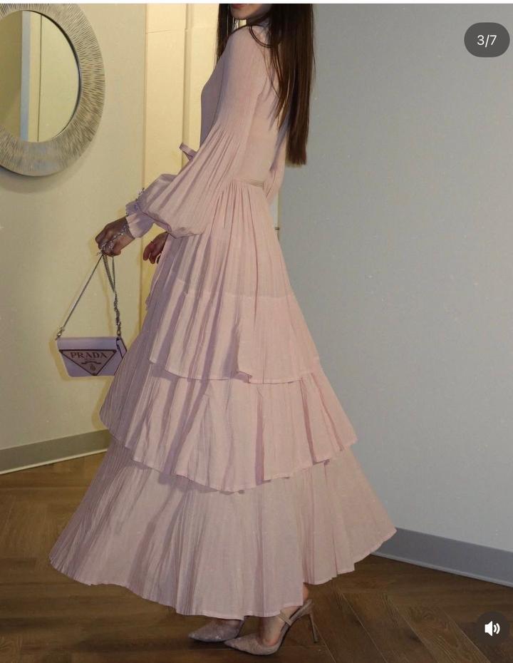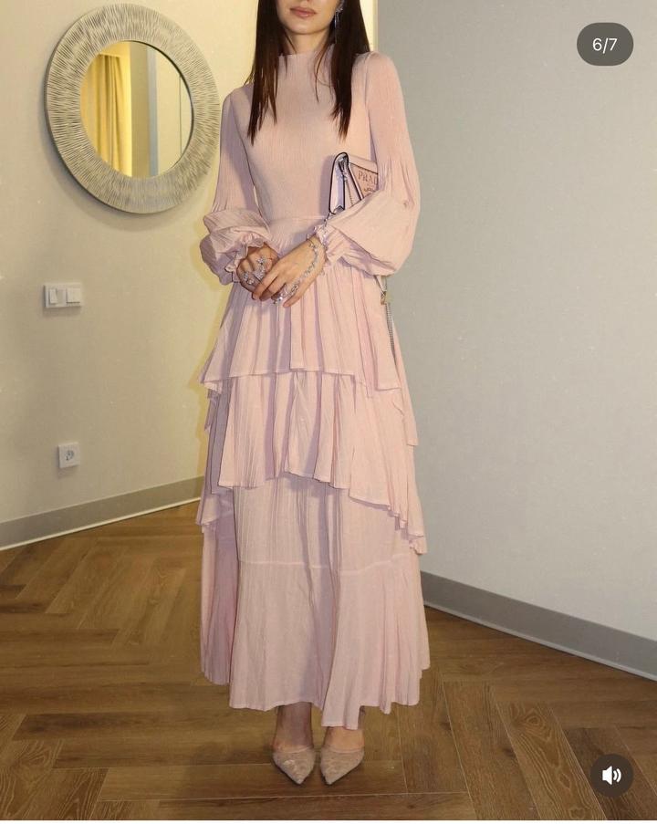 Нежное и элегантное платье в пудрово-розовом оттенке. Модель выполнена из лёгкой струящейся ткани с многослойной юбкой, которая придаёт образу воздушность и женственность. Верх с аккуратной высокой горловиной и длинными рукавами с мягкими рюшами создаёт утончённый силуэт. Платье свободного кроя, комфортно сидит и красиво движется при ходьбе. Идеально подойдёт для особых случаев, фотосессий, ужинов или романтических встреч. Легко сочетается с классическими лодочками и минималистичными аксессуара Артикул: 530408