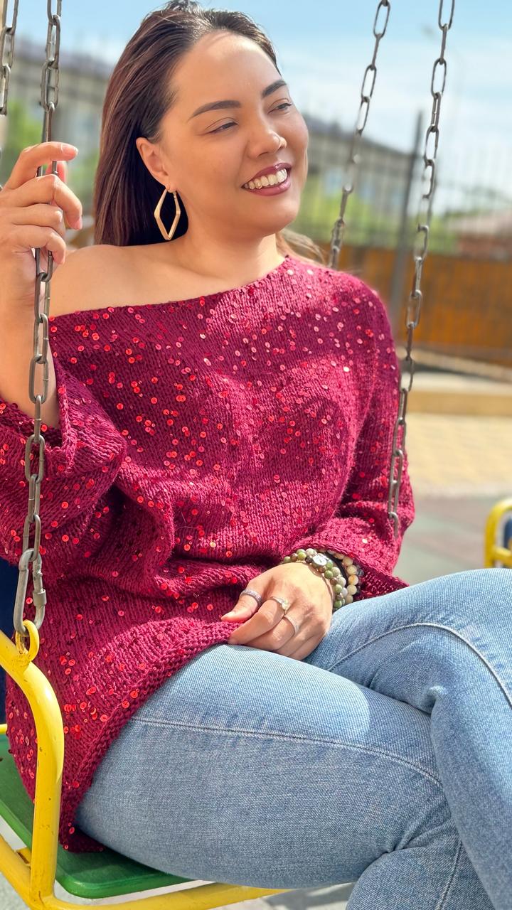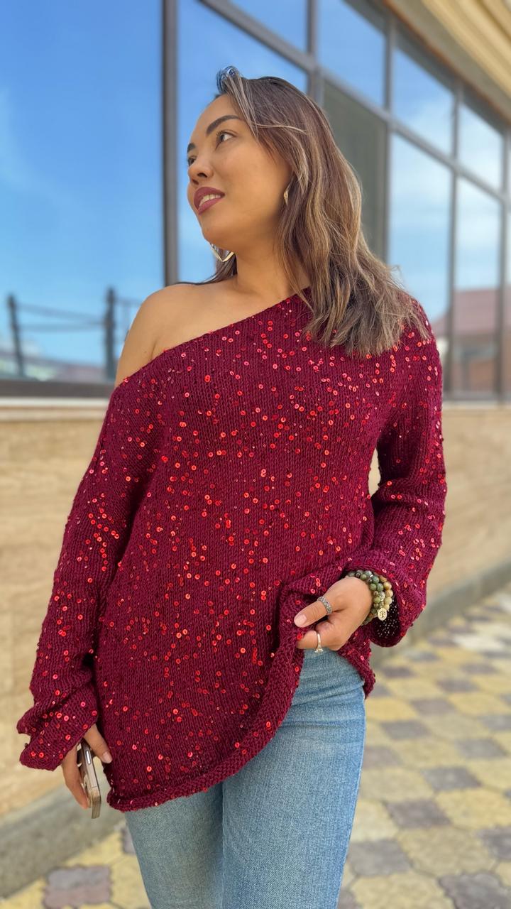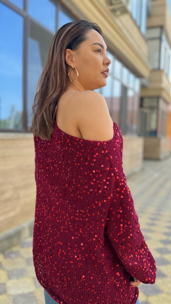 Джемпер со вспущенным плечом. Ручная работа. Пух норки и пайетки. Размер L-XL Артикул: 530411
