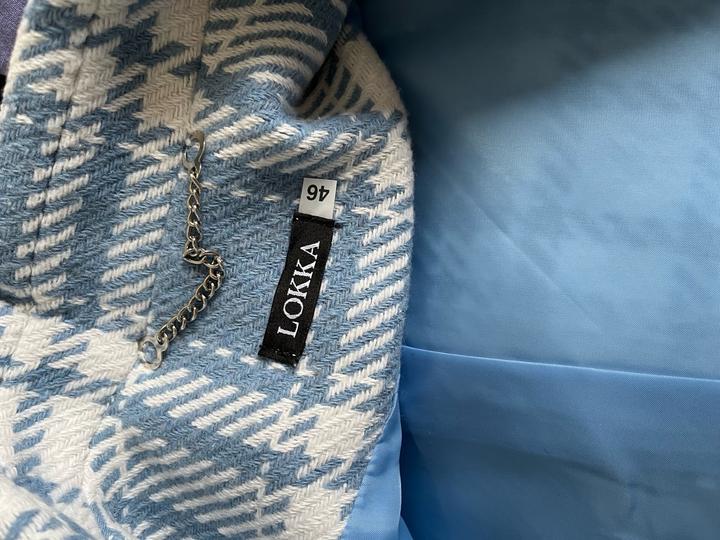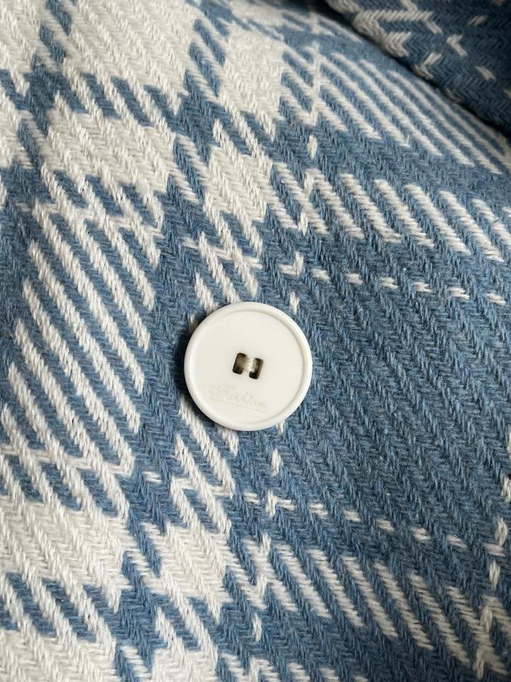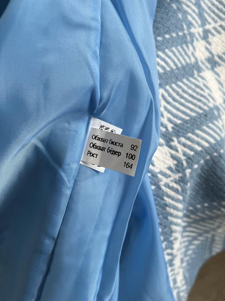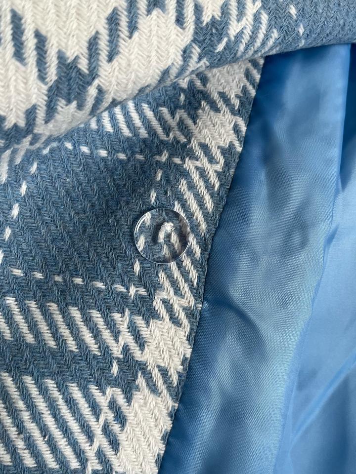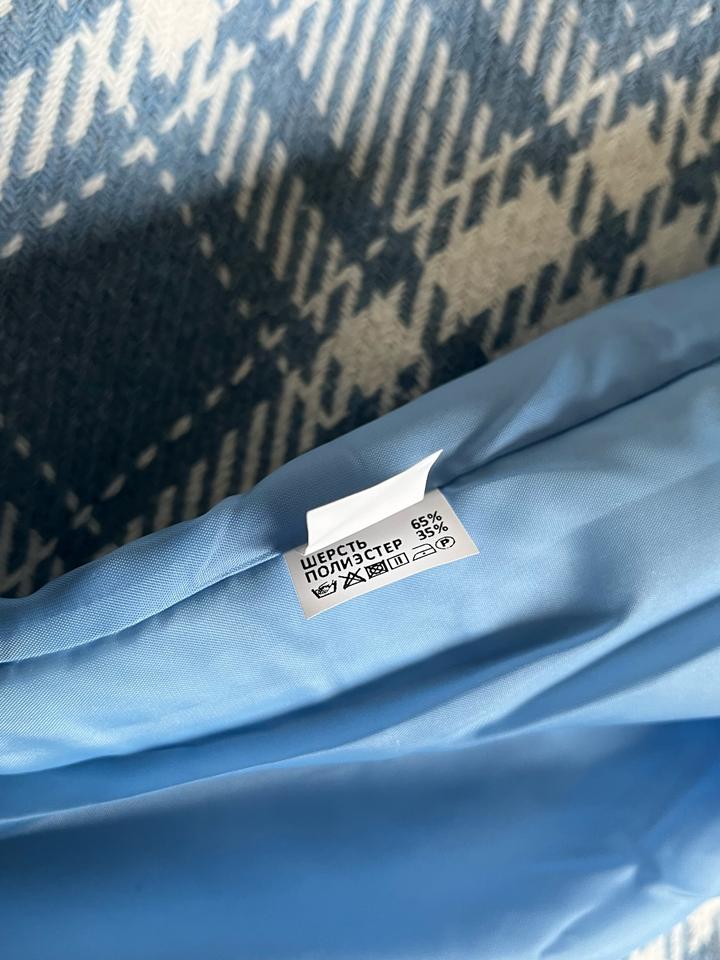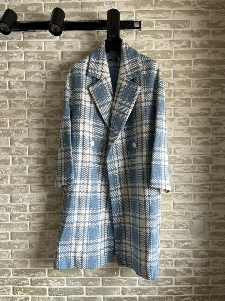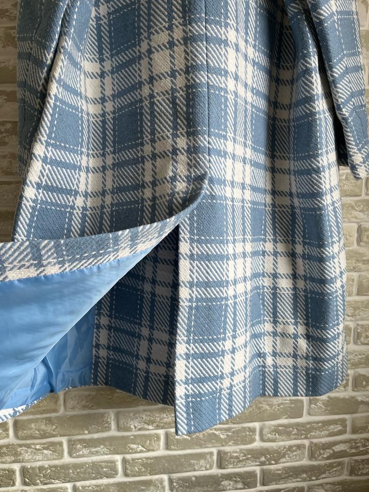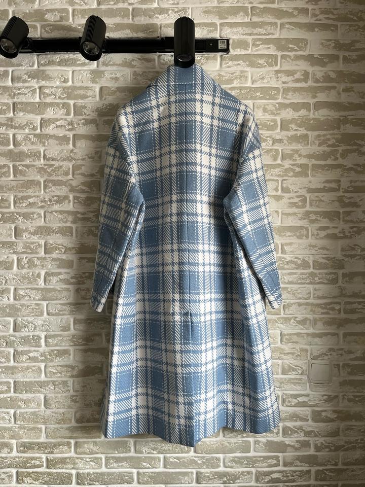 Стильное двубортное пальто в крупную клетку. Новое, с бирками (остаток после закрытия онлайн-магазина). Небесно-голубой оттенок. Высокое содержание шерсти (65%), очень теплое и мягкое. Свободный крой, сзади шлица. Размер: 46 (RUS). Подойдет на рост 164 см. Абсолютно новое, в идеальном состоянии. Качественная фурнитура, подкладка в тон. Станет ярким акцентом в весеннем гардеробе. Артикул: 530512