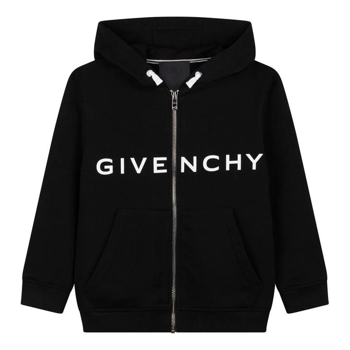 Это классический детский кардиган с капюшоном (зип-худи) черного цвета. Особенности: Белый логотип Givenchy на груди, застежка на молнию, капюшон и два накладных кармана спереди. Благодаря фактурной флисовой подкладке такой материал хорошо сохраняет тепло, поэтому в модели с широким эластичным поясом-кулиской будет комфортно в прохладный день. Вдоль левого бокового шва дизайнер марки расположил логотип, который частично вышили черной нитью. Артикул: 530886