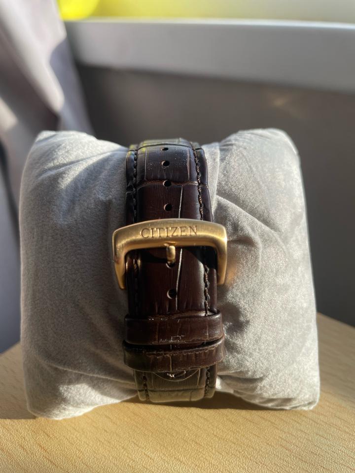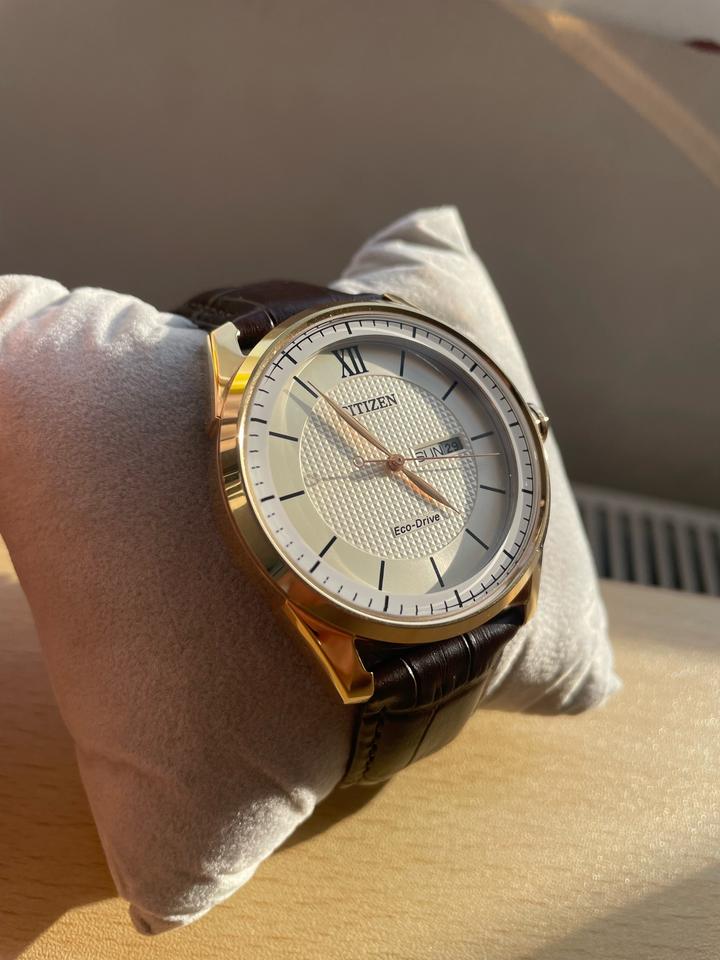 Продам часы Citizen AW0082-19A. Состояние новых часов, практически не пользовались. Роскошный розово-золотистый корпус из нержавеющей стали с коричневым кожаным ремешком и утончённым розово-золотистым безелем. Нежный кремовый циферблат с розово-золотистыми стрелками, римскими цифрами и штриховыми метками. Окошко даты и дня недели — в позиции 3 часа. Оснащены инновационной системой Eco-Drive (Caliber J800): не требуют замены батареек, питаются от света (в т.ч. солнечного), с запасом хода до 240 д Артикул: 531072
