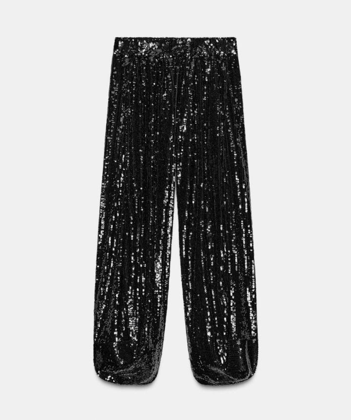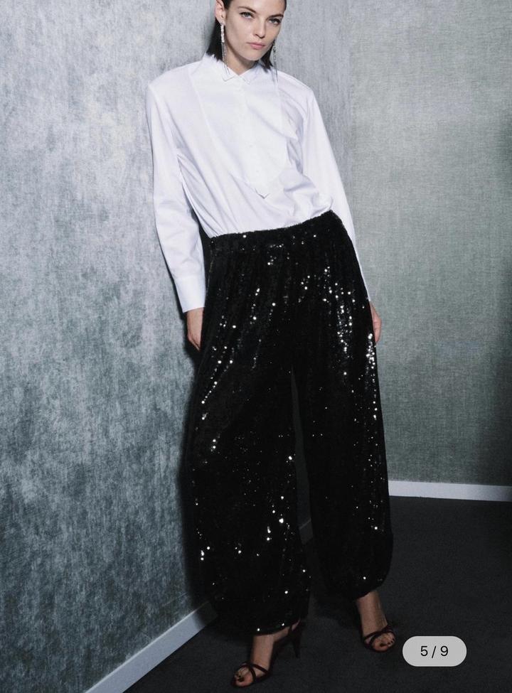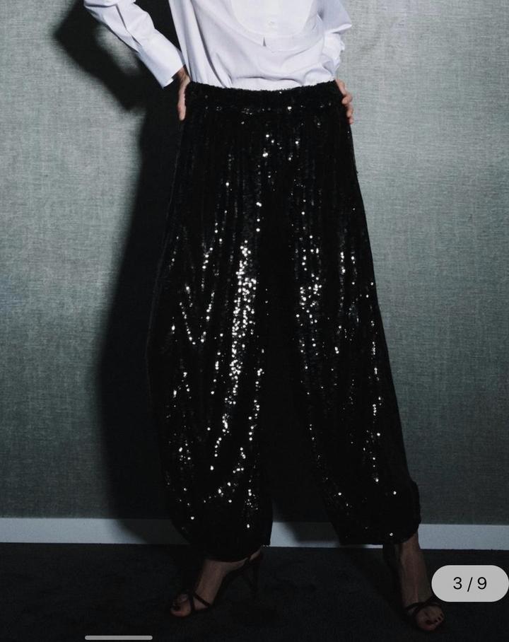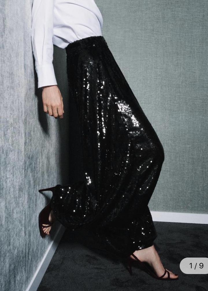 Новые брюки с пайетками от Zara Размер S, но большемерят до M Цвет черный К низу округленные Акцентная вещь любого гардероба, находка для вечерних образов Артикул: 531493