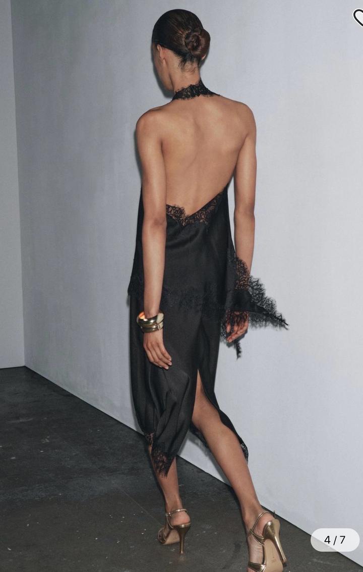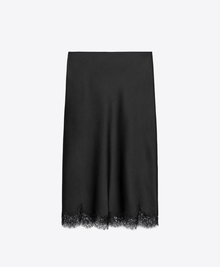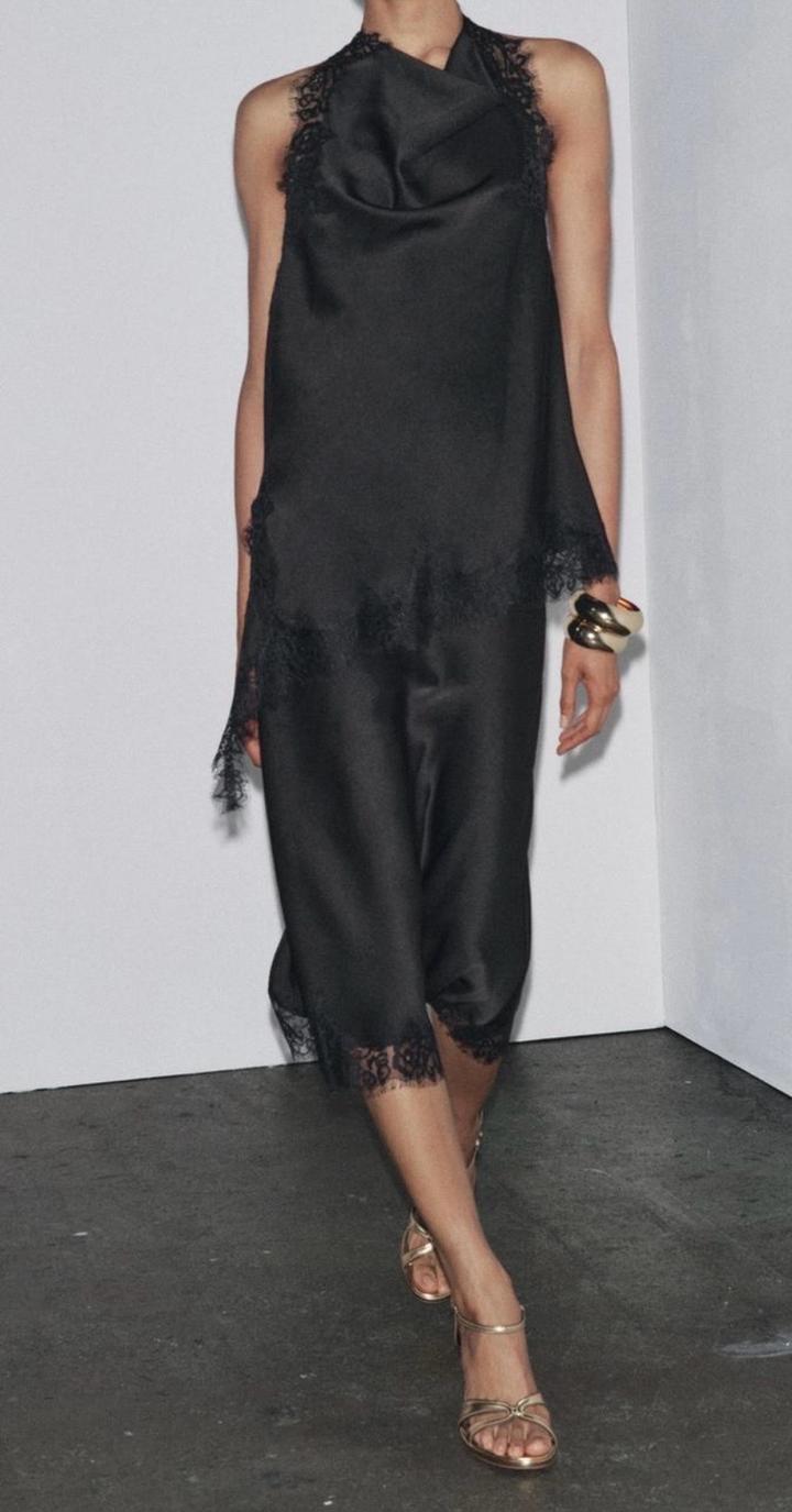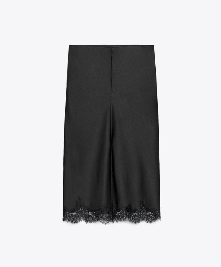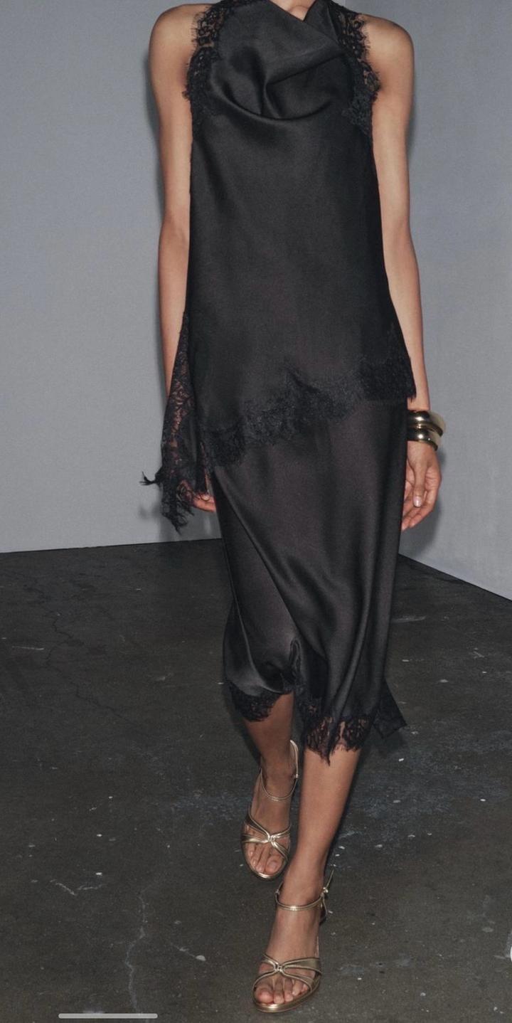 Новая атласная юбка с кружевом от Zara Размер S, но большемерят на М Цвет черный Ткань атлас Длина миди Средняя посадка, сзади разрез, подол в кружеве, потайной замок Артикул: 531510