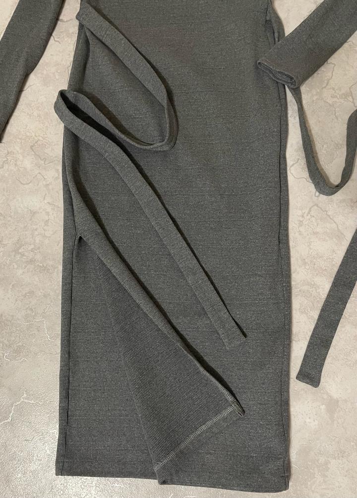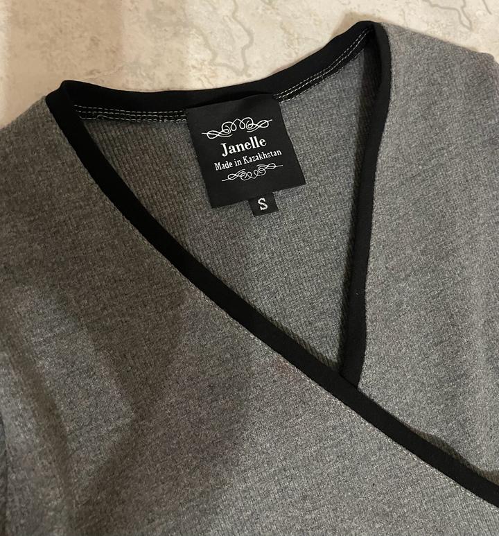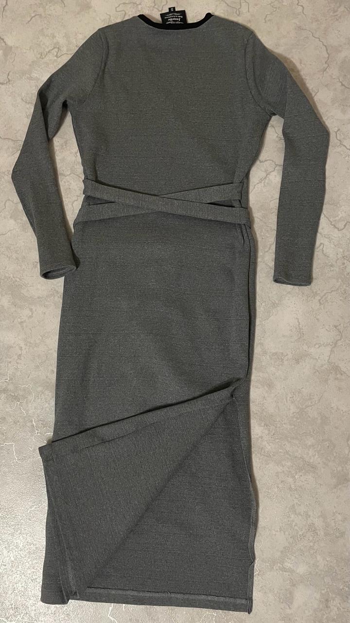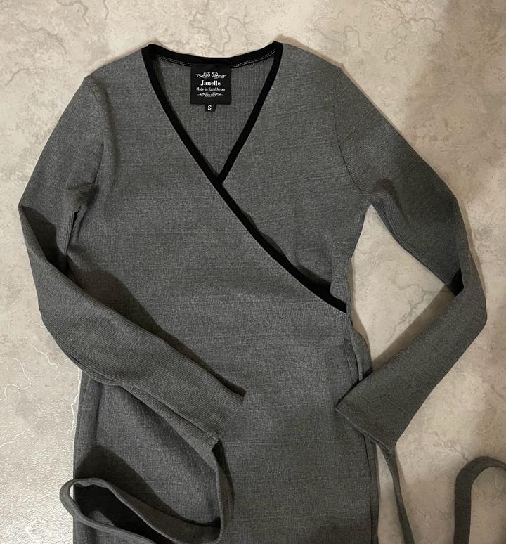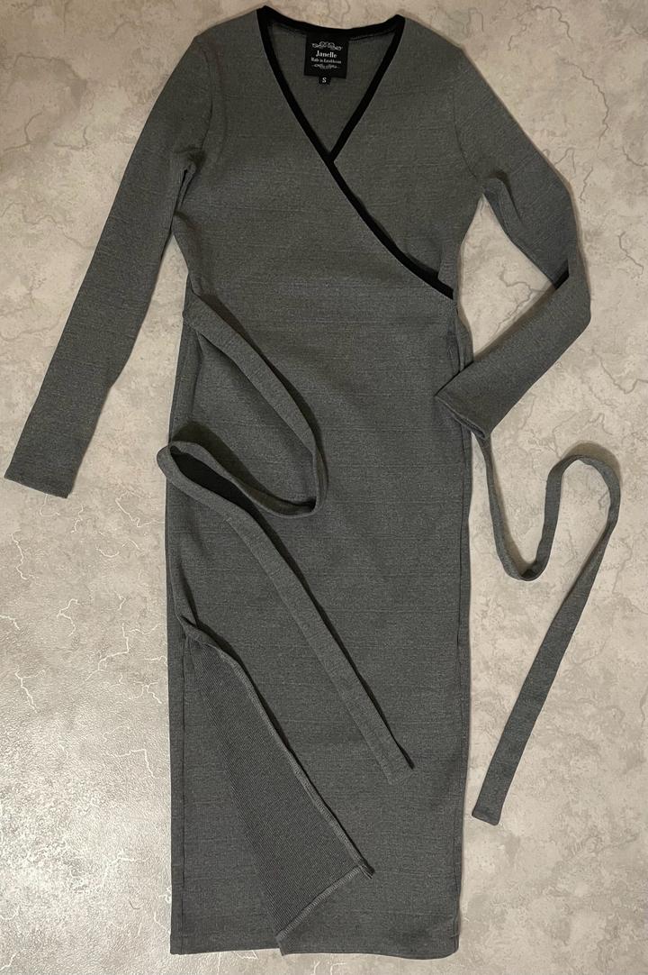 Прямое облегающее трикотажное платье казахстанского производства Zhanelle в сером цвете с черной окантовкой сверху, на запах. С длинными поясками. Сбоку разрез. Очень практичное, теплое, в отличном состоянии. Длина миди. Артикул: 531524