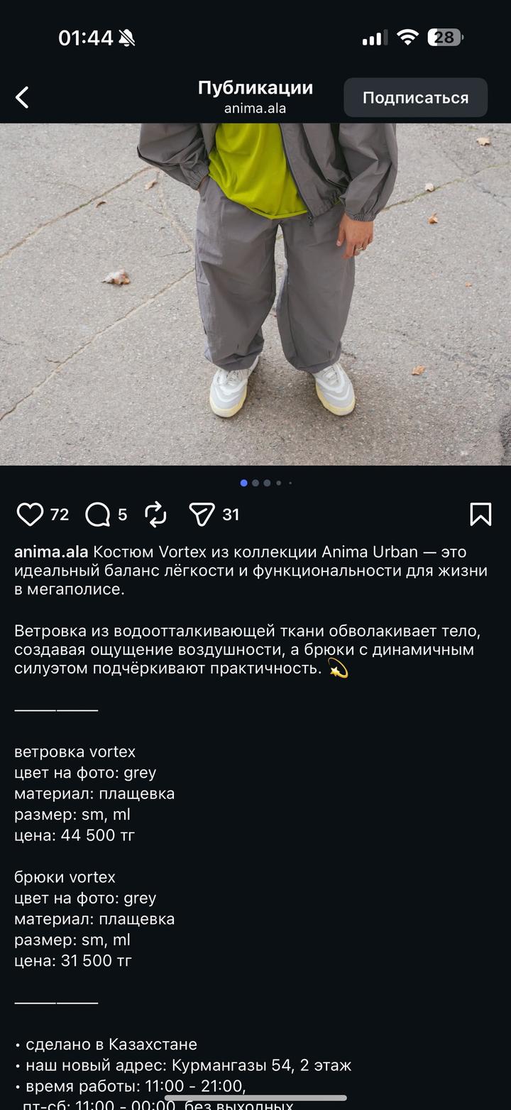 Новый чёрный ( унисекс) спортивный комлект Vortex от казахстанского бренда -Anima. Подойдёт как для женщин так и для мужчин. Комлект состоит из ветровки ( бомбера) из водоотталкивающей плащевой ткани , и брюк с завязками на талий. Добавила фото в сером цвете чтобы было понятнее как сядет на мужчине . Крой оверсайз , размер М/Л даже на XL подойдёт.Состояние отличное ни разу не носили . Покупала со скидкой за 68 000. Артикул: 531819