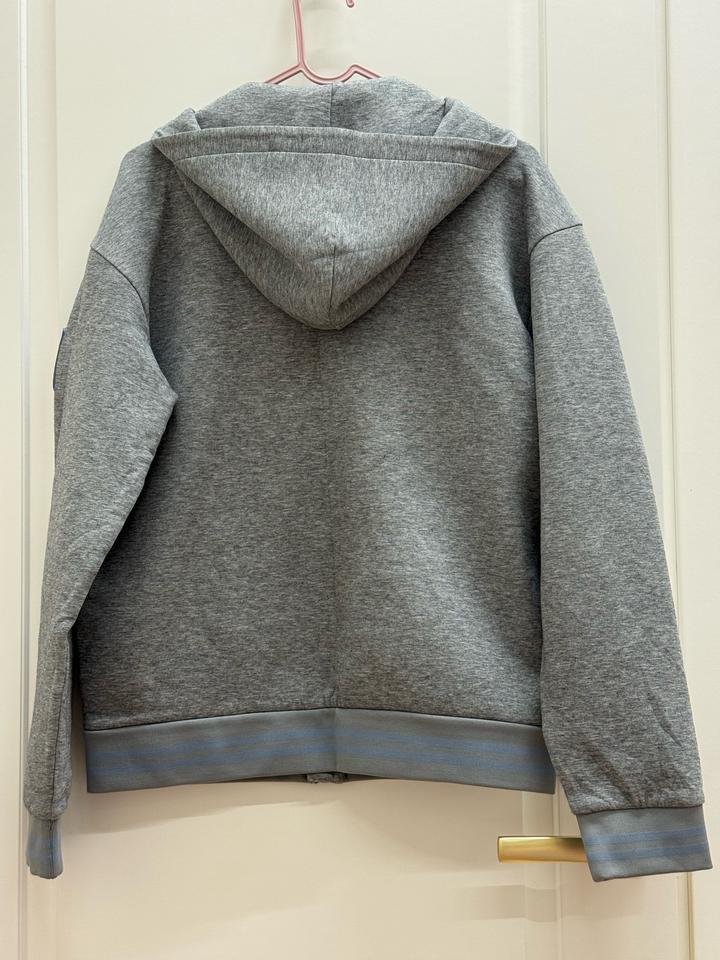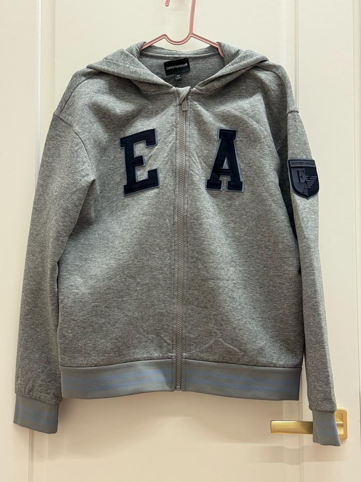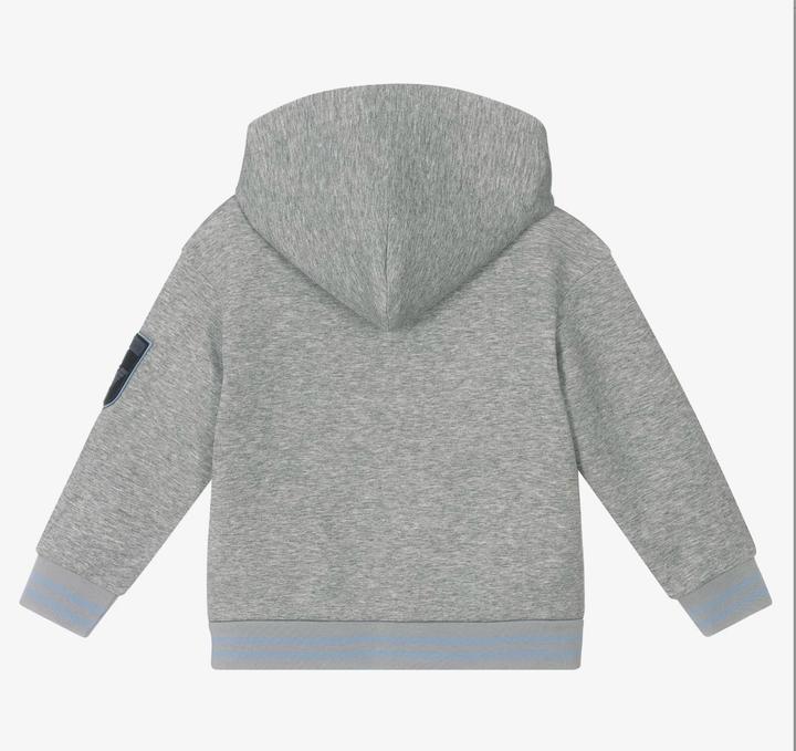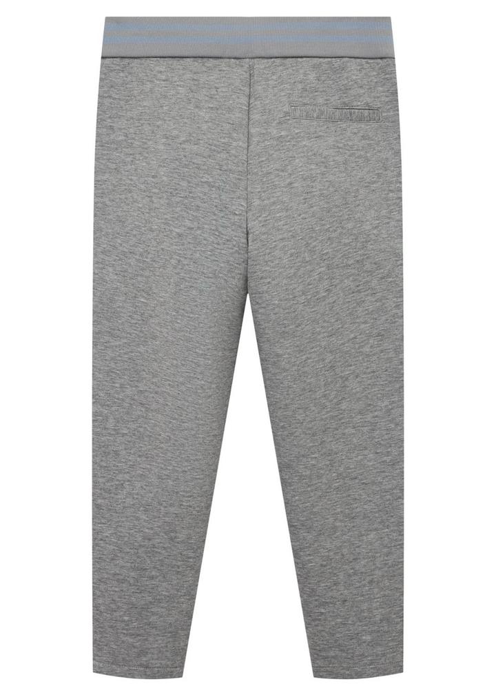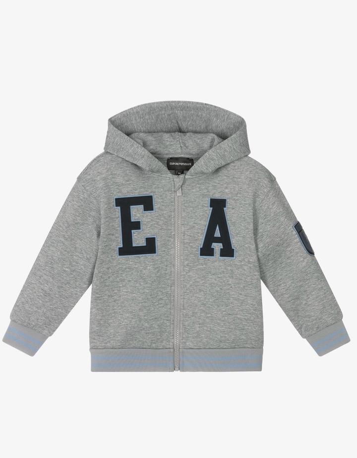 Серые брюки из мягкого хлопкового трикотажа, который не сковывает движения, подойдут и для прогулки, и для занятий физкультурой. Чтобы посадка изделия была максимально комфортной, предусмотрели широкий пояс-резинку. Голубые полосы на нем перекликаются с цветовой гаммой объемной вышивки спереди. Серая толстовка на молнии для мальчиков от Emporio Armani. Дизайнерский акцент достигается благодаря аппликации логотипа в виде двухцветных синих букв на передней части и фирменному логотипу Eagle. Артикул: 532132