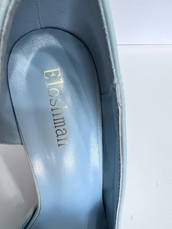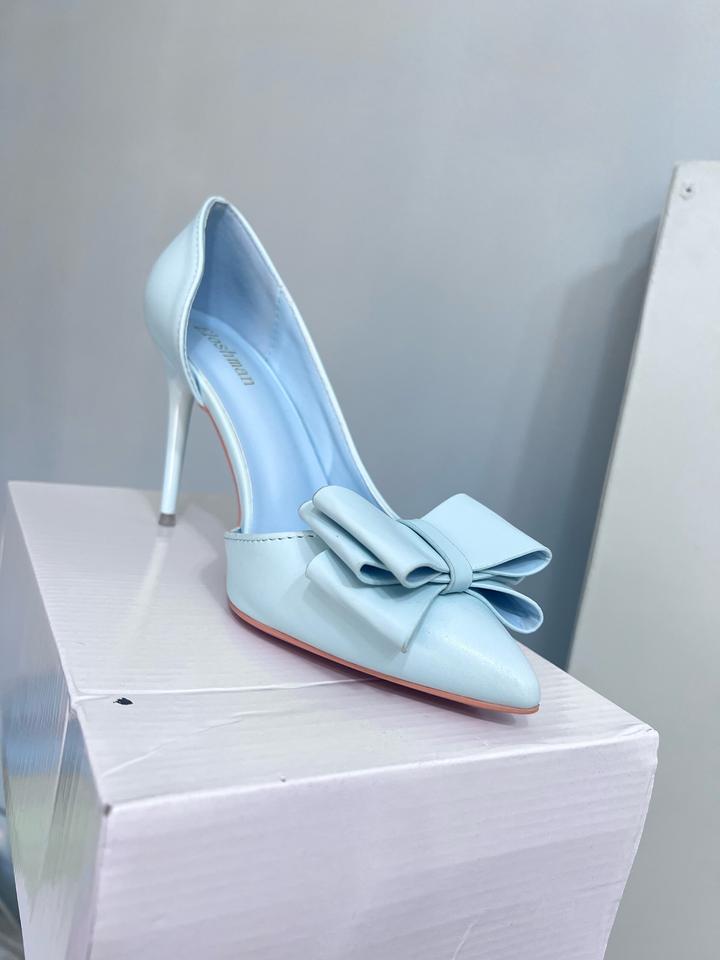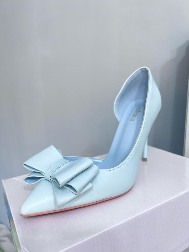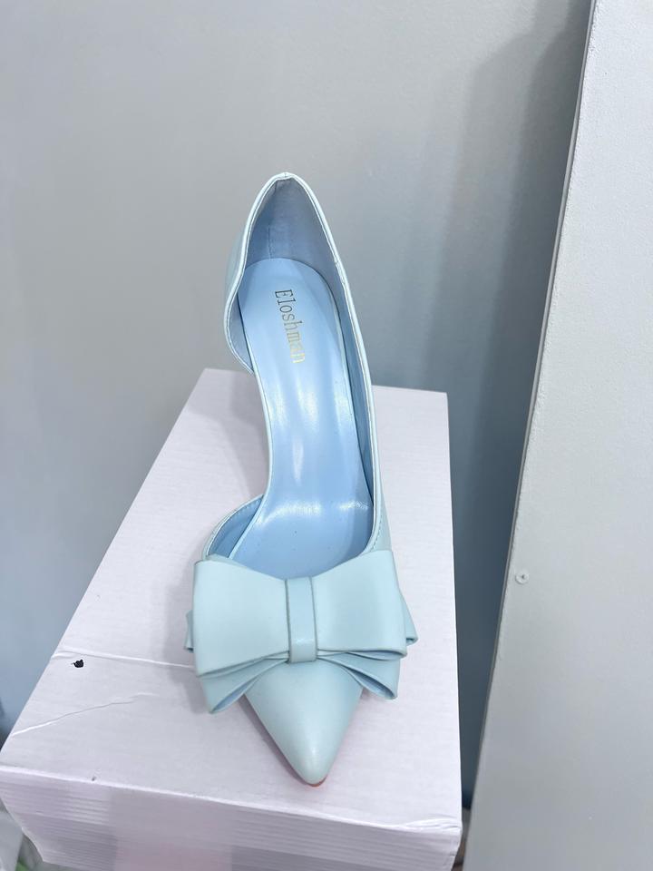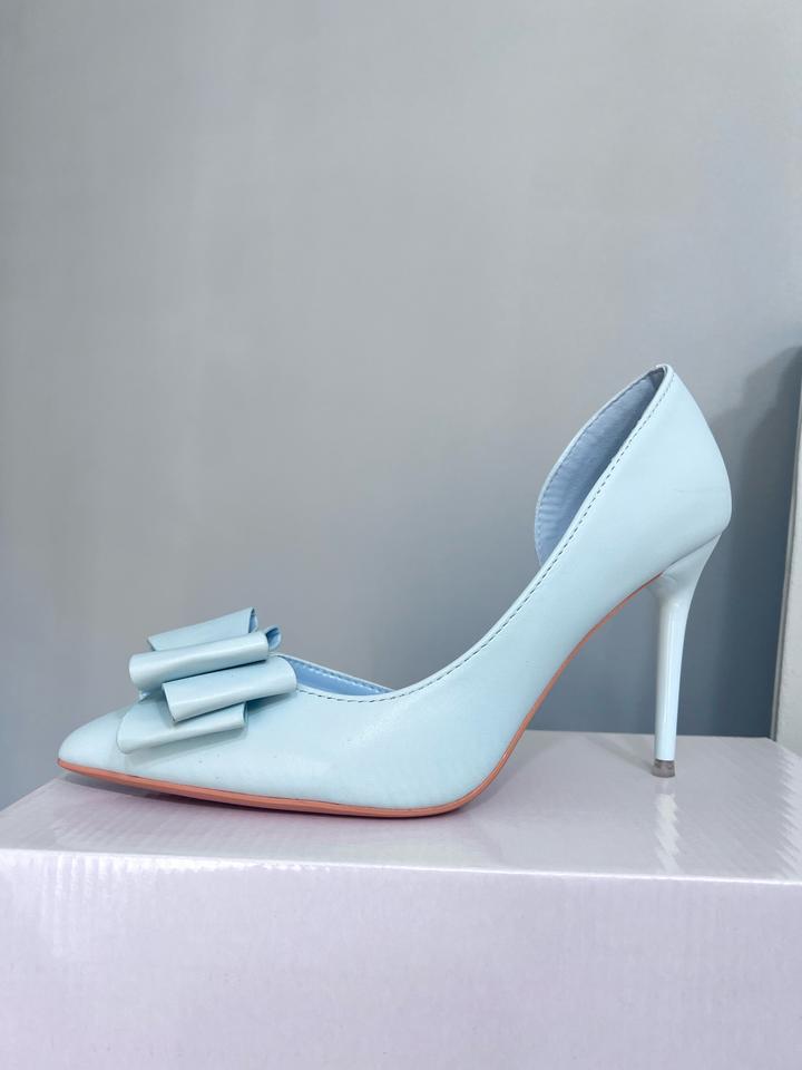 Нежно голубые туфельки с бантом. Размер 39. Подойдет на стопу 25,5 см. На подошве написано (41) это 39 размер по нашему. Обязательно отмерьте ногу на бумаге как на картинке. Если у вас нога 25,7 вам будут малы. Каблук 10 см. Артикул: 532429