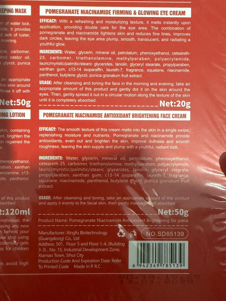 Продается уходовый набор косметики. В набор входят: 1.Тоник с гранатом и ниацинамидом - освежает, увлажняет, подготавливает кожу. 2.Очищающая пенка - бережно смывает загрязнения, оставляя кожу чистой и мягкой. 3.Сыворотка - выравнивает тон и повышает упругость. 4.Крем для лица — удерживает влагу и делает кожу бархатной. 5.Крем для глаз — уменьшает следы усталости и освежает взгляд. 6.Лосьон/эмульсия — даёт лёгкое увлажнение и сияние в течение дня. Артикул: 532475