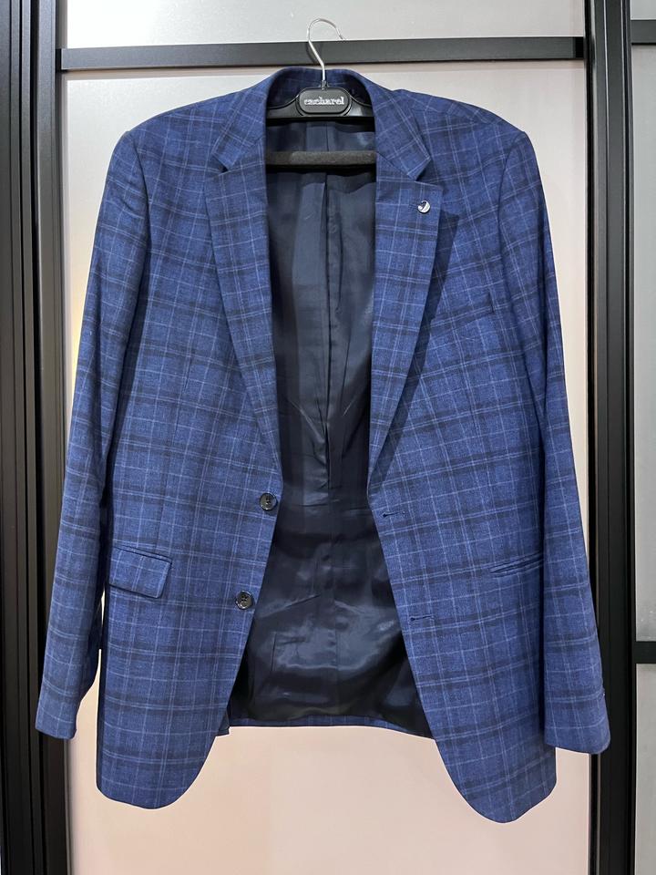 - Оригинальный бренд Cacharel - Качественная шерстяная ткань (96% шерсть, 4% эластан) - Элегантный тёмно-синий цвет в клетку - Современный приталенный силуэт Пиджак (размер 48): — приталенный крой — однобортный — прорезные карманы с клапанами — нагрудный карман — носился редко, без дефектов Брюки (размер 50): — зауженный крой — новые, не носились — застёжка на молнию и крючок — боковые карманы Артикул: 532537