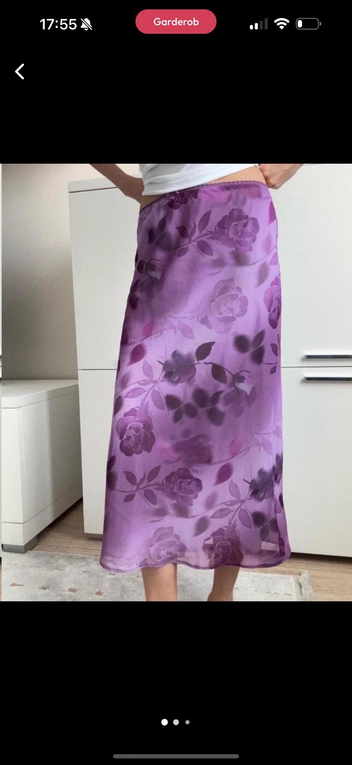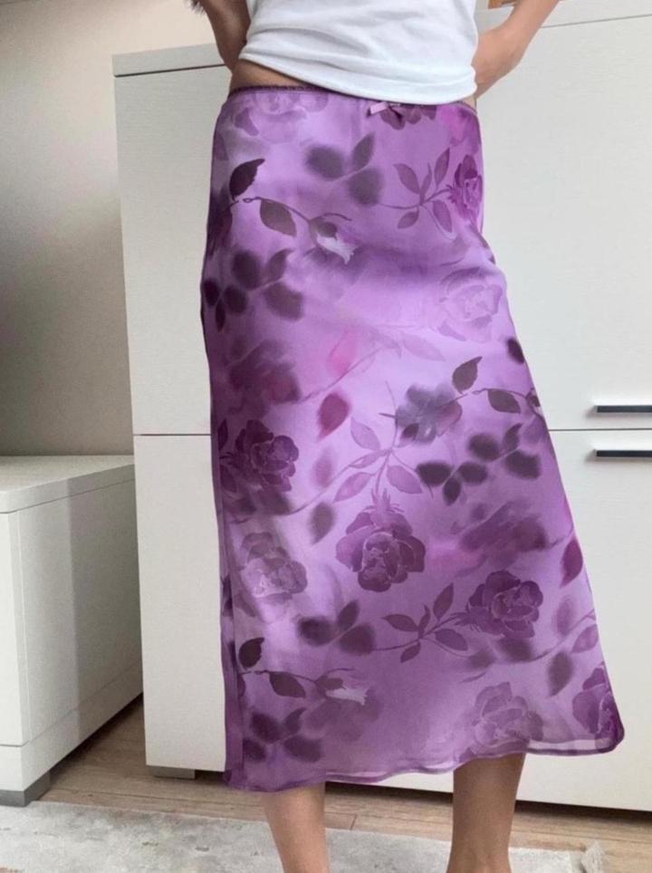 Сиреневая атласная юбка миди с цветочным принтом. Модель прямого, слегка расклешённого кроя, мягко струится по фигуре и красиво переливается на свету. Лёгкая ткань с нежным блеском создаёт женственный и элегантный образ. С подкладкой. Артикул: 533203