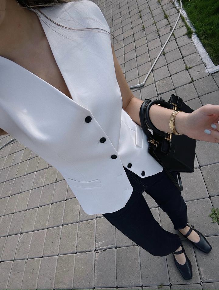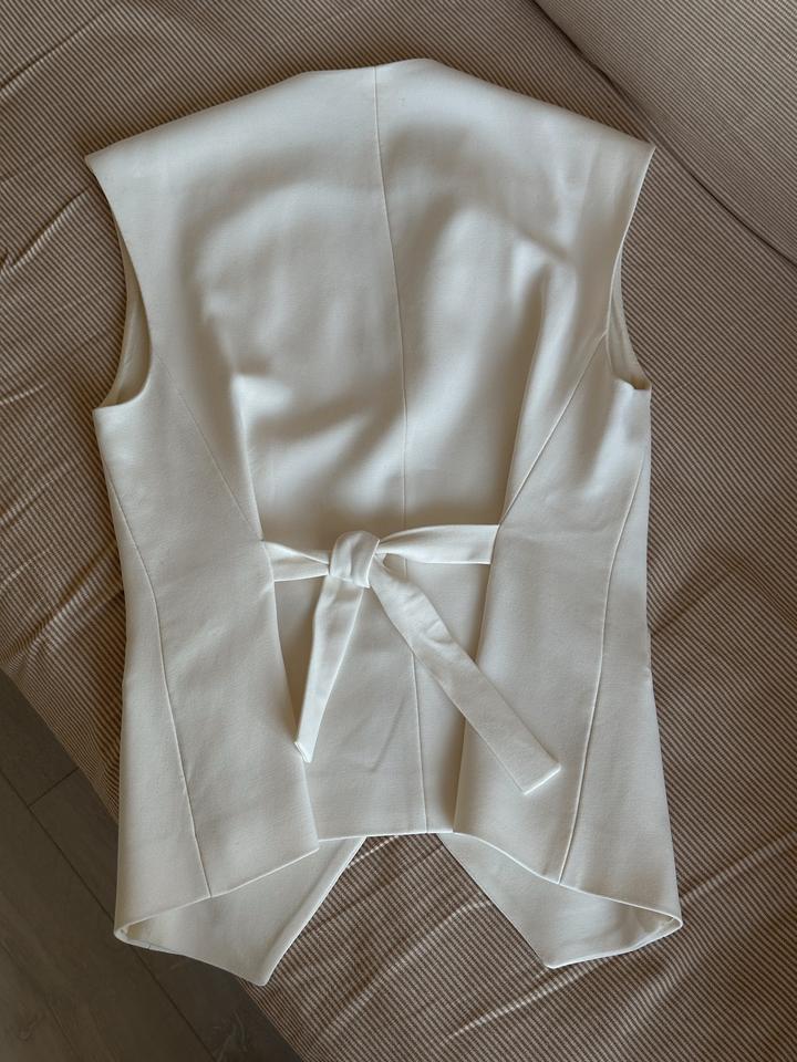 Белая костюмная жилетка. Из плотной ткани, в составе вискоза. Талию можно затянуть, либо расслабить (на завязках). Состояние идеальное, только пару выходов. Цвет белый молочный Артикул: 533276