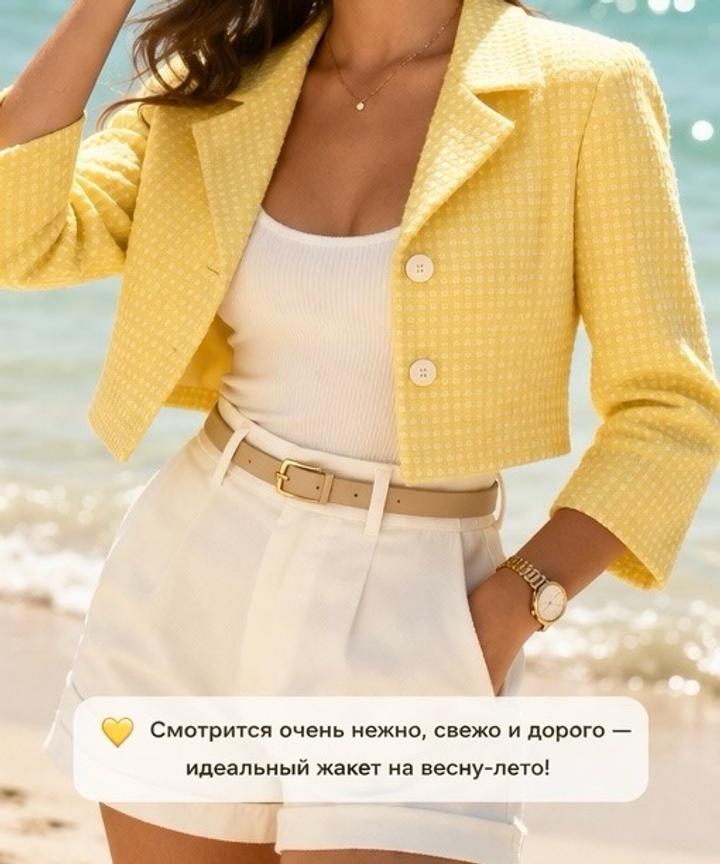 Стильный и женственный жакет, который освежает образ и делает его дороже с первого взгляда. Идеален для весны и лета Преимущества: • Нежный лимонный оттенок — освежает лицо • Фактурная премиальная ткань • Приталенный силуэт — красиво подчёркивает фигуру • Аккуратные пуговицы в тон • Короткий крой — выглядит современно и дорого • Лёгкий и комфортный в носке Плотная фактурная ткань премиум-класса (хлопковый твид) Почему стоит купить: Артикул: 533507