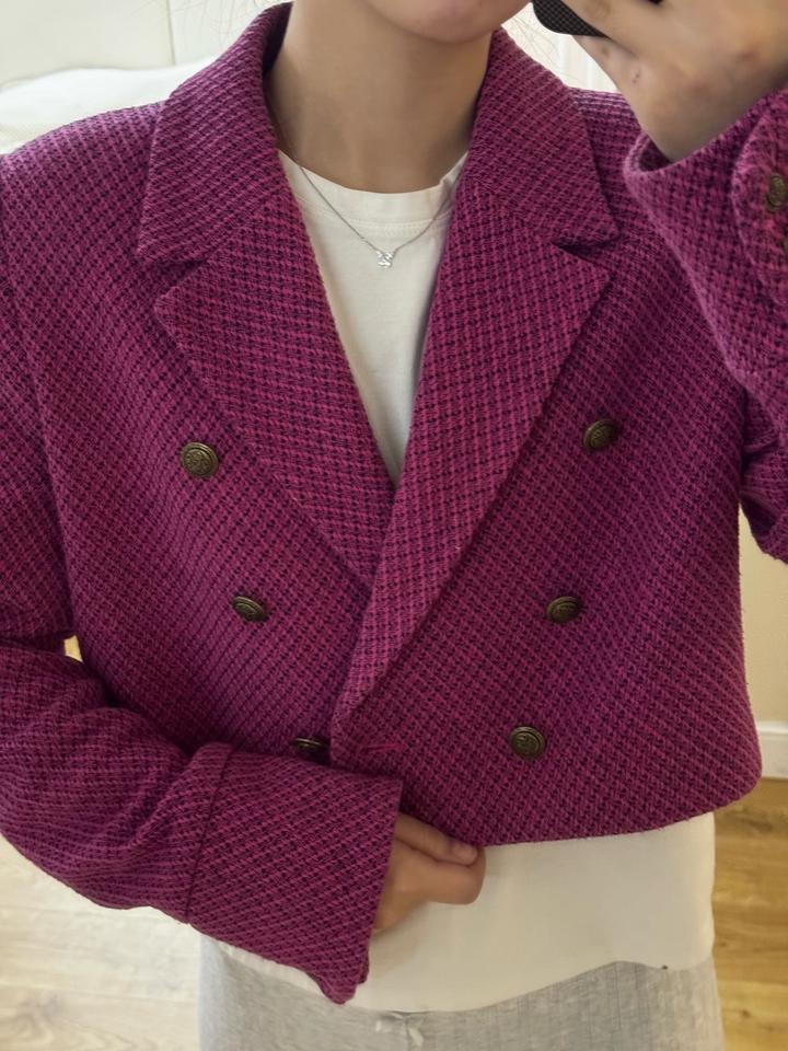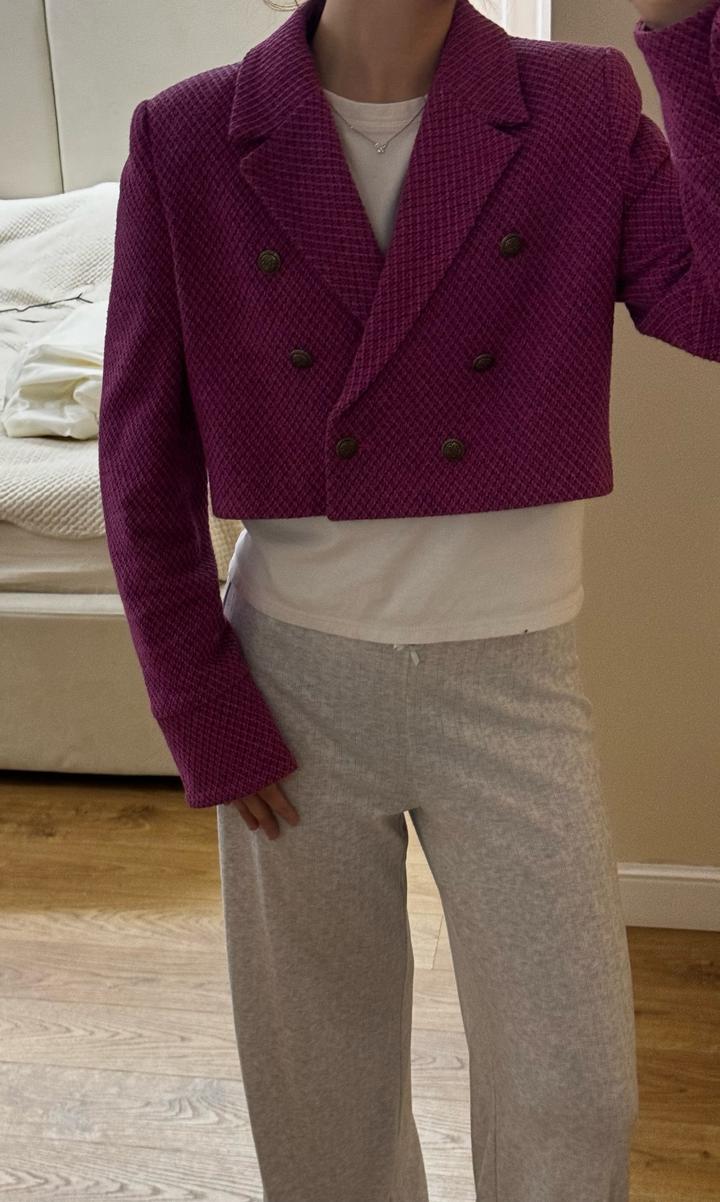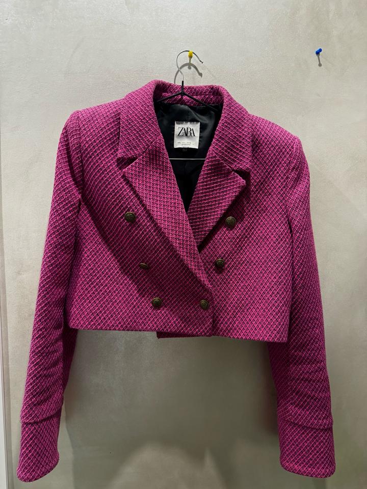 Розовый, укороченный пиджак Zara. В идеальном состоянии. Все пуговицы на месте. Выглядит очент стильно. Есть подплечники. На бирке размер L, но на М, S сидит идеально. Артикул: 534124