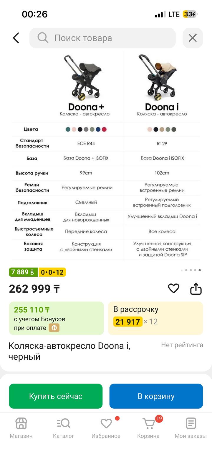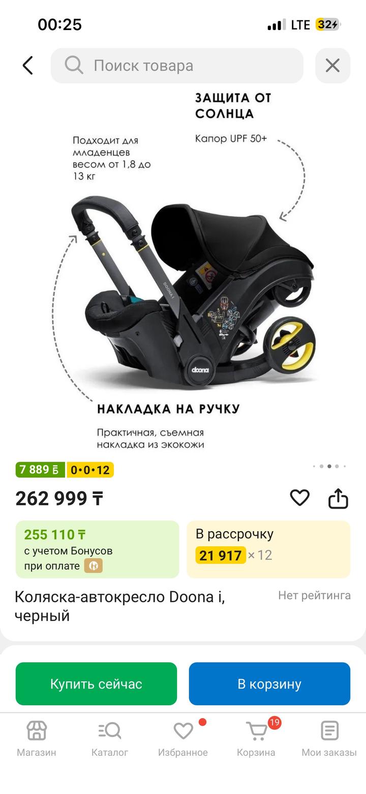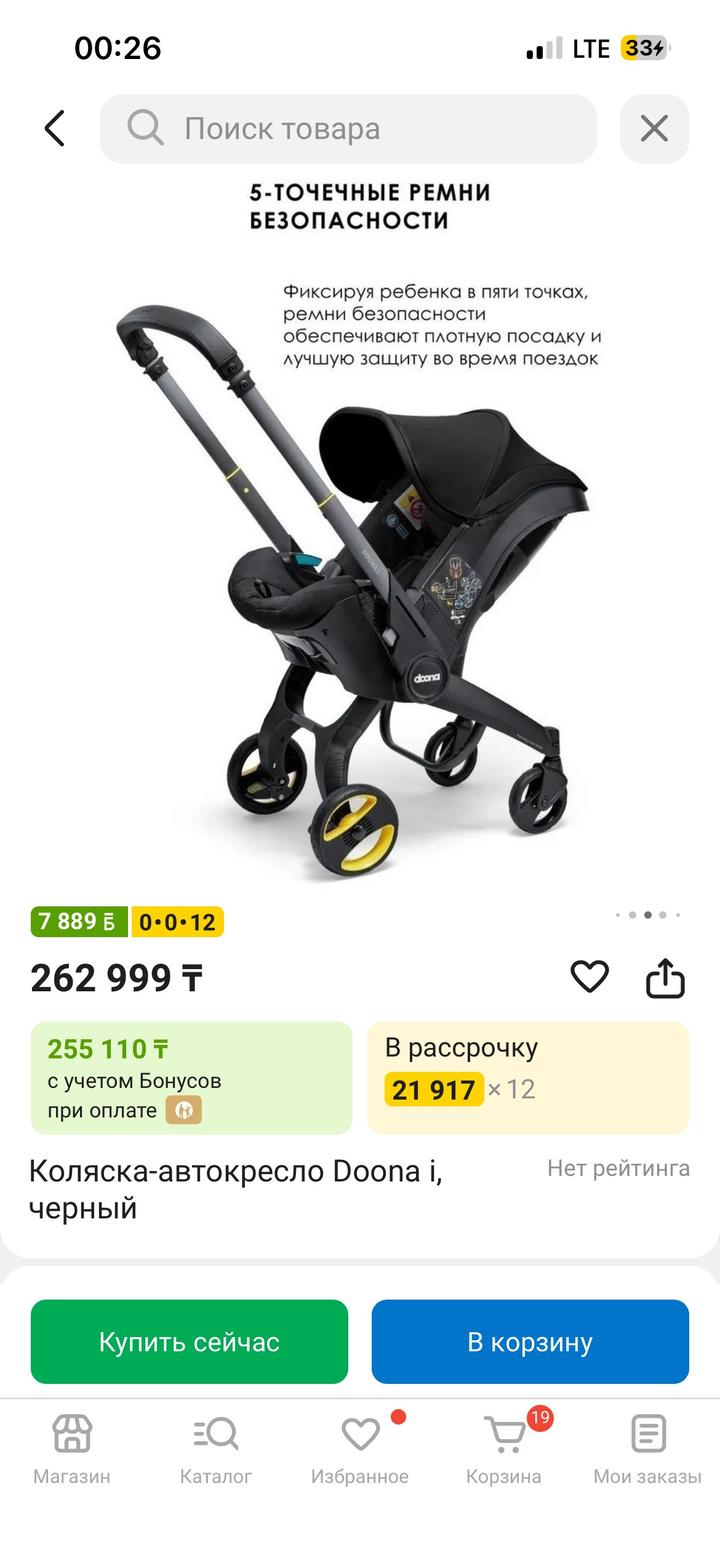 В идеальном состоянии коляска люлька фирмы DOONA+ использовали в основном как люльку в машине в зимнее время. По колесам видно что почти как коляску не использовали. Новая такая стоит больше 200.000 тенге, оригинал. Артикул: 534148