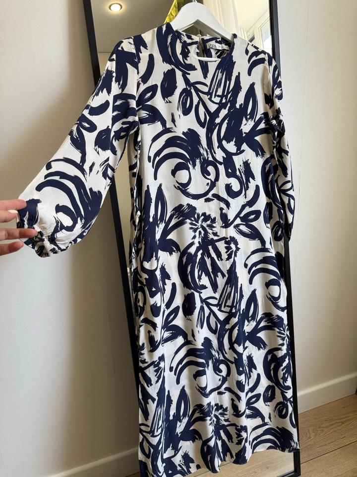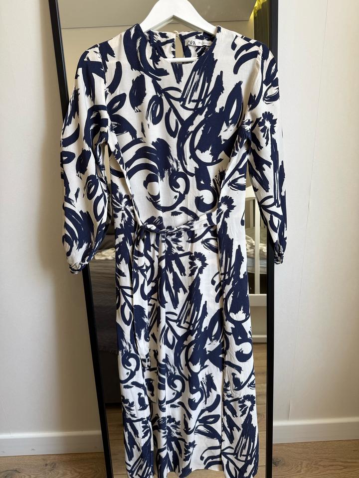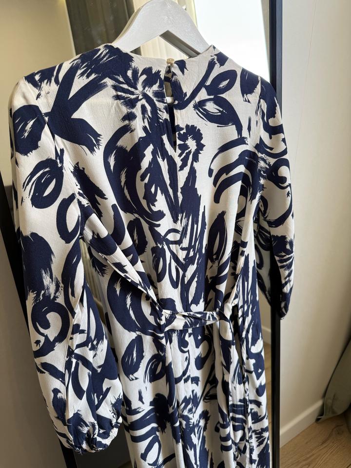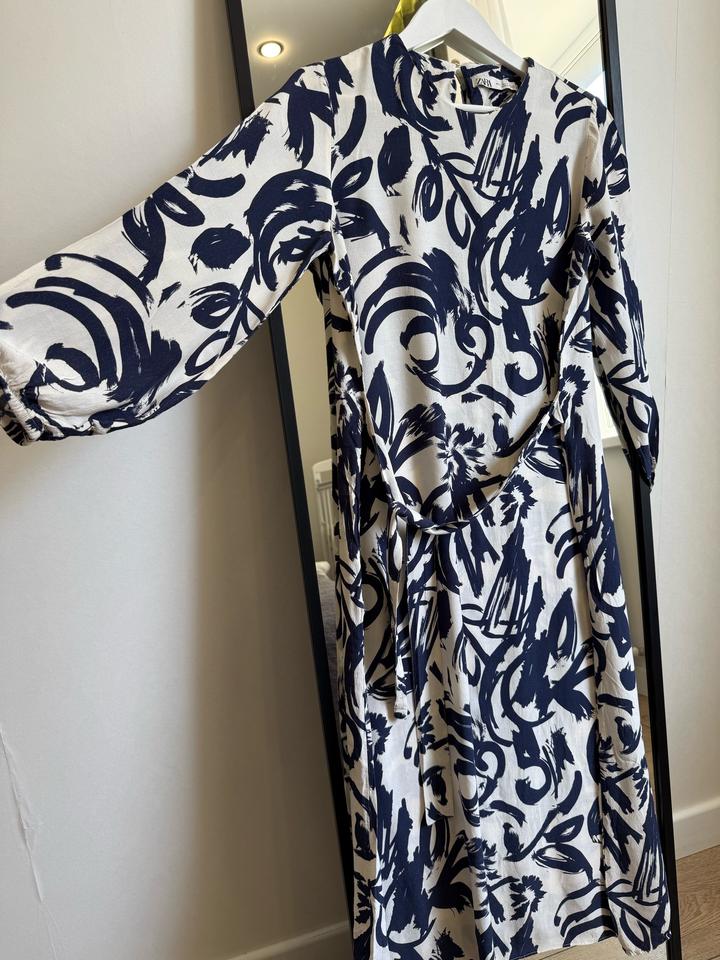 С красивыми принтами миди платье. С поясом сшитым. Приятный материал к телу. Одевала немного. Подойдет на С-М Артикул: 534372