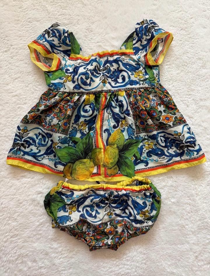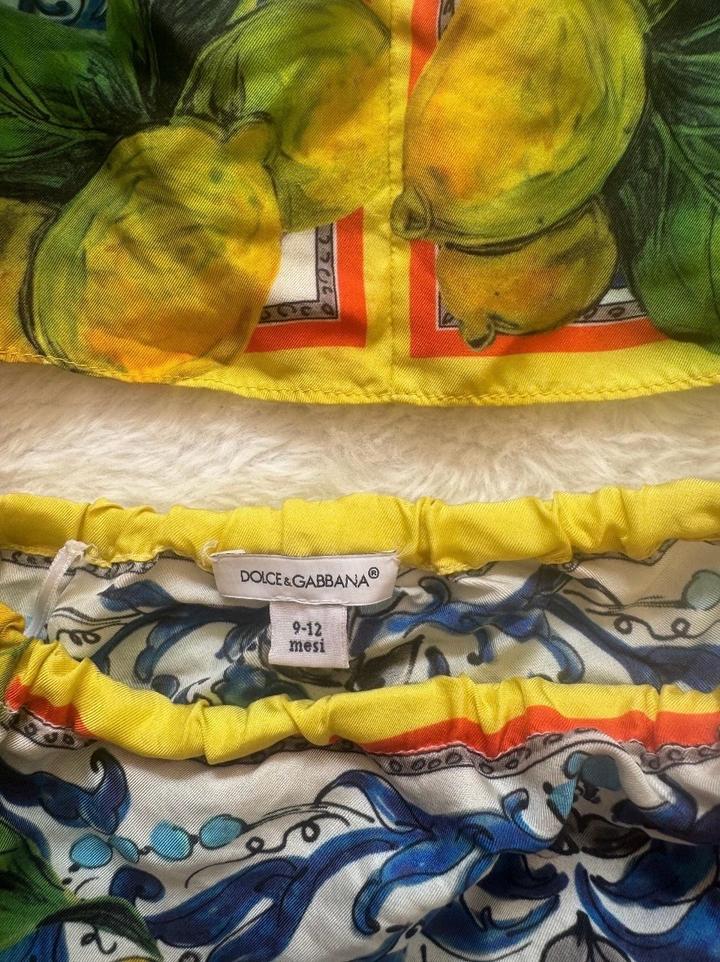 Продам очень красивый комплект Dolce & Gabbana для девочки Платье + шортики (трусики) в комплекте Яркий фирменный принт с лимонами, смотрится очень стильно и нарядно Идеально на лето, фотосессии, праздники или просто на выход Размер: 9-12 месяцев Состояние хорошее, носили аккуратно Артикул: 534487