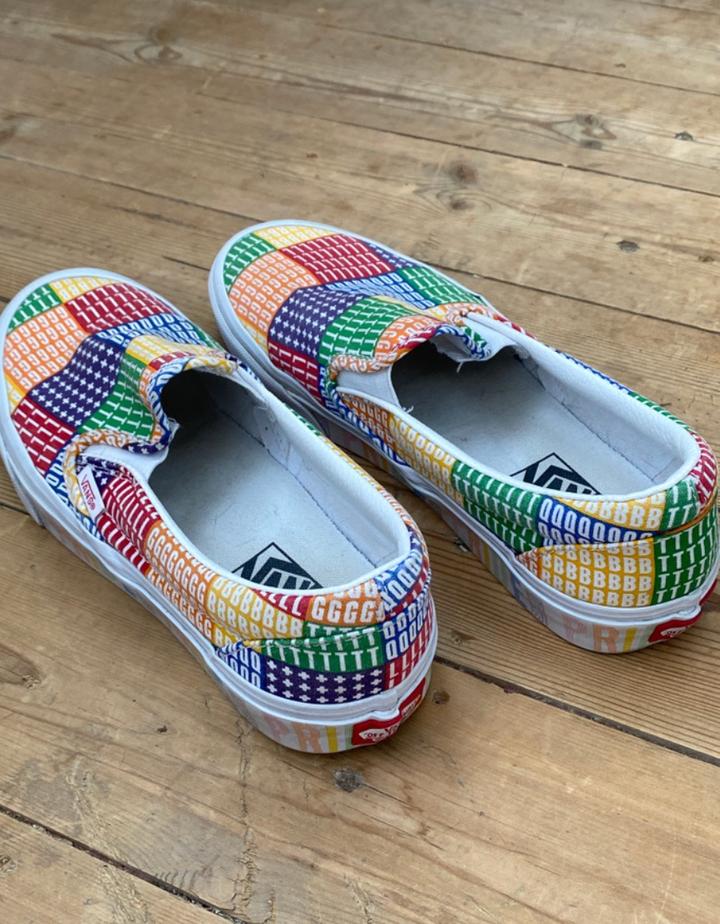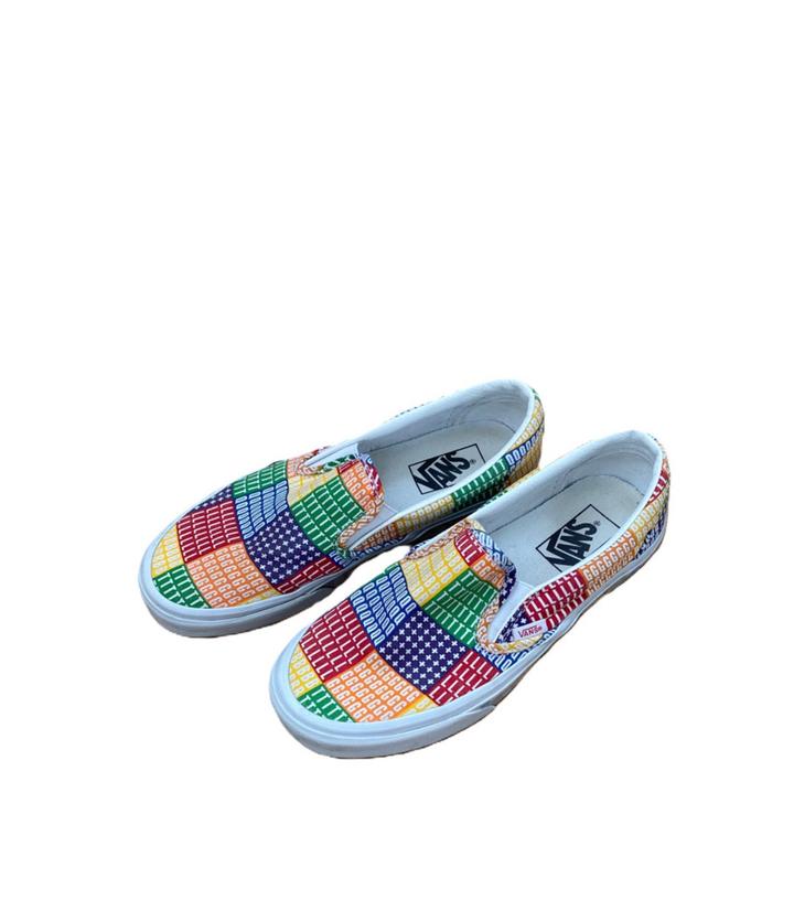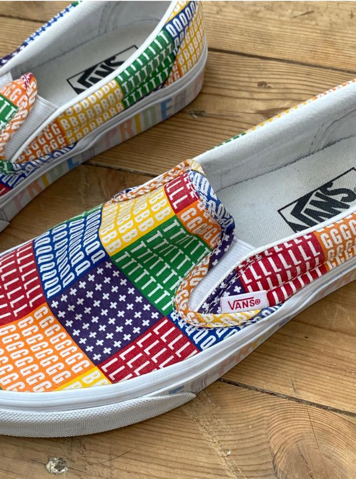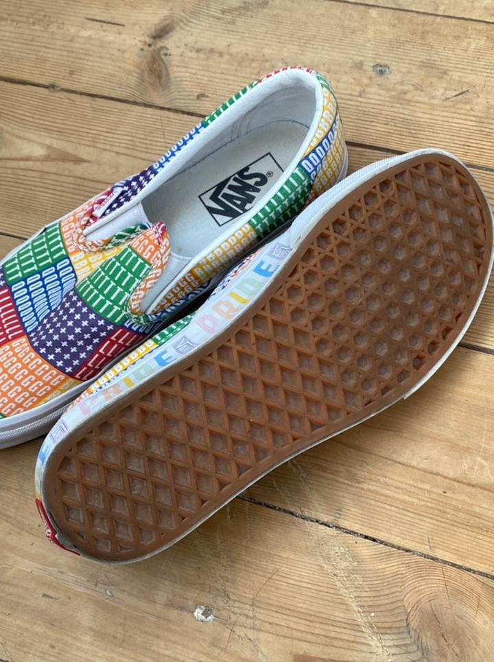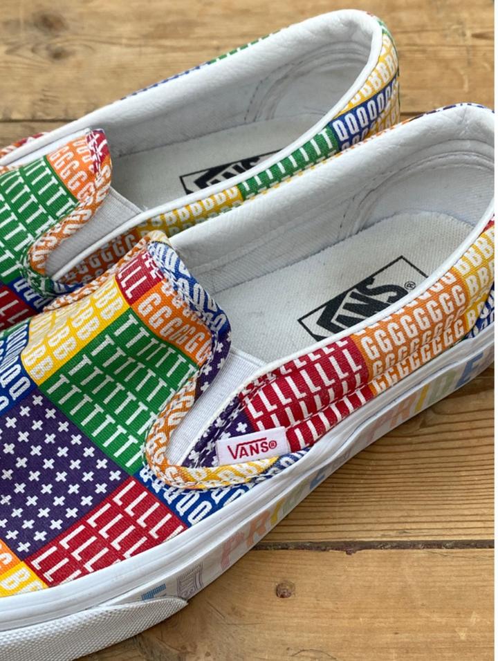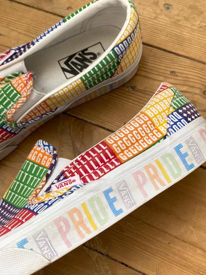 Vans PRIDE Classic Slip-on, 24.5 см по стопе, состояние хорошее на 8/10. Из минусов - залом на правом ботинке по подошве (смотрите фото), по желанию можно отнести в химчистку или почистить самому. В остальном пара целая, задники внутри в порядке, подошва в порядке. Раскраска яркая, интересная, особенно для людей в современном контексте : Артикул: 534557