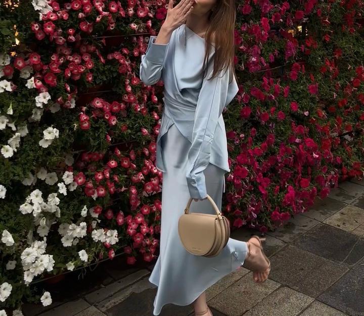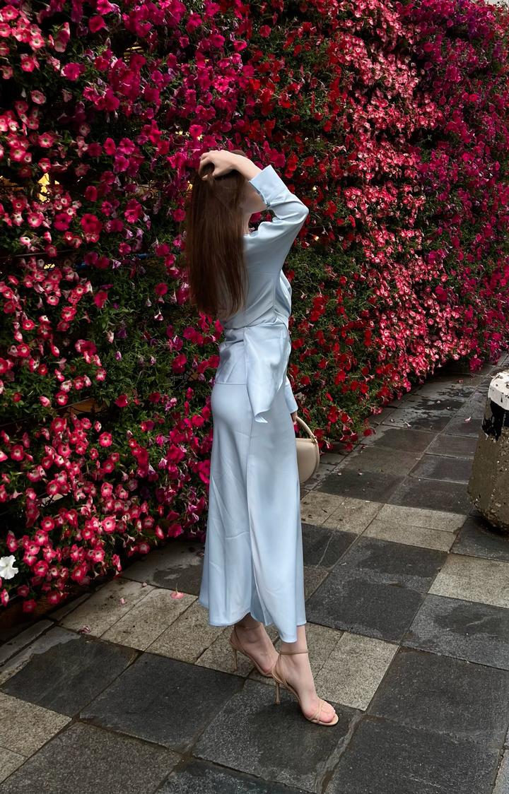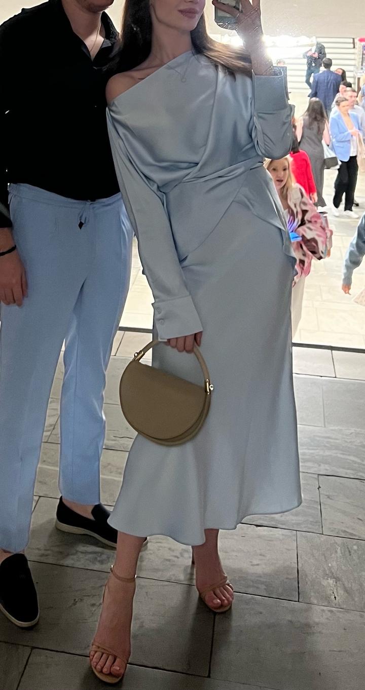 Костюм с юбкой и блузкой в нежно голубом цвете от Nora Label, надевала 2 раза на 2 часа. Размер S, но подойдет и на 44 тоже, можно завязывать по разному спереди, я завязывала так, чтобы одно плече оголено было Артикул: 534649