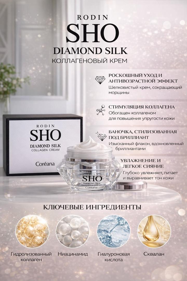 Коллагеновый крем Rodin SHO Diamond Silk от Coreana — премиальный уход для упругости и сияния кожи. Формула с гидролизованным коллагеном, ниацинамидом, гиалуроновой кислотой и скваланом глубоко увлажняет, питает и разглаживает морщины. Крем улучшает эластичность, выравнивает тон и придаёт коже здоровое сияние. Лёгкая шелковистая текстура быстро впитывается, не оставляя липкости, подходит для ежедневного ухода. Артикул: 534752