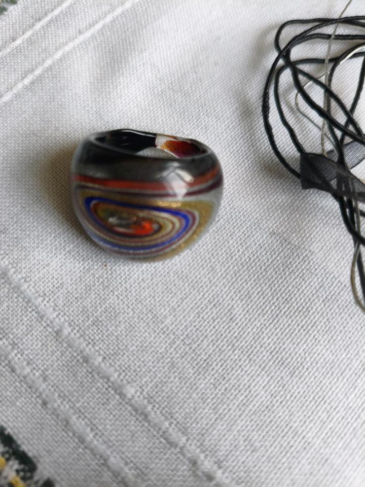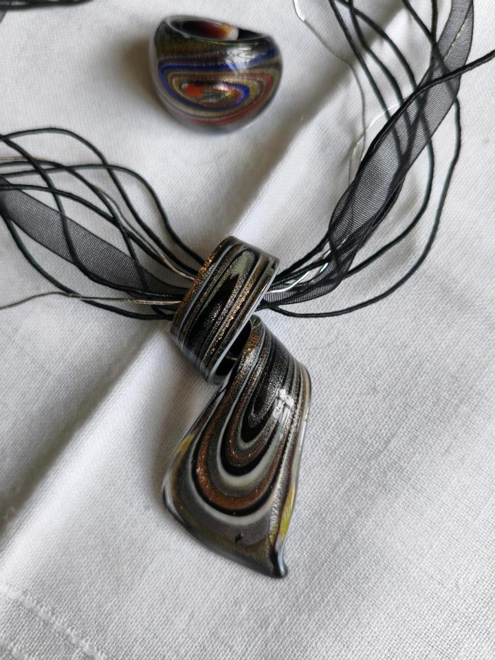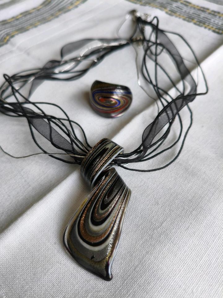 Очень эффектный комплект из мурманского стекла,куплен в Венеции,чокер на лентах с массивной подвеской,кольцо с добавление полоски фиолетового цвета Артикул: 534777