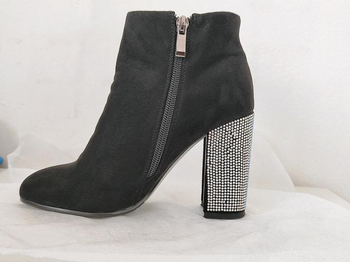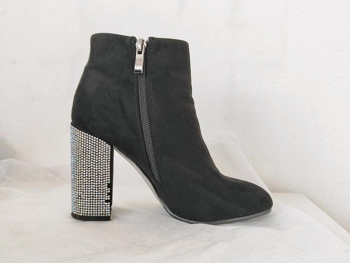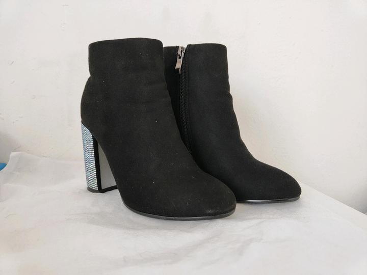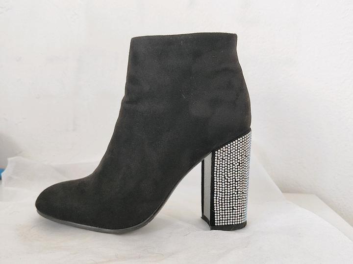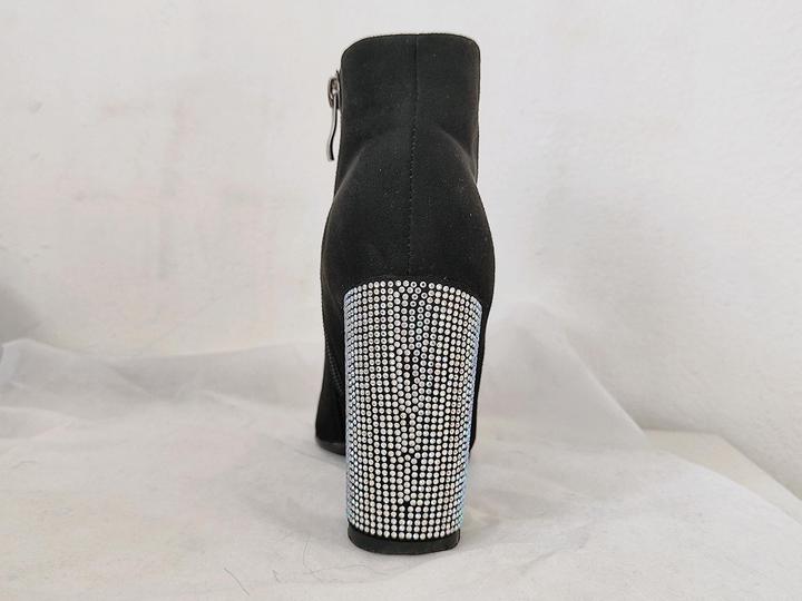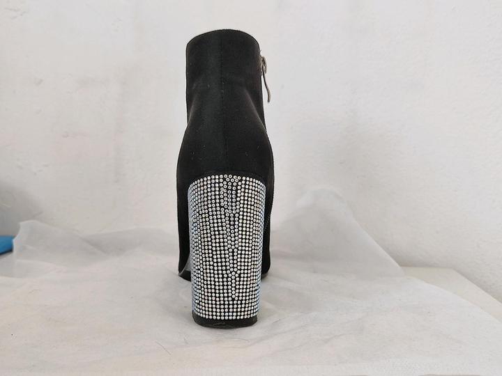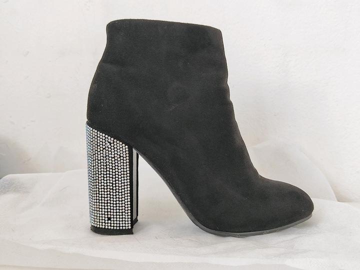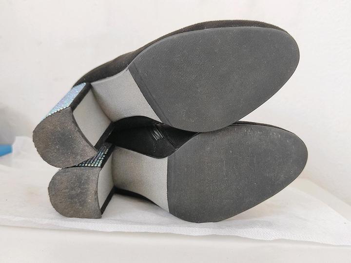 Черные ботильоны, материал - нубук. Стразы дуохромные, отсутствуют несколько штук. В целом состояние очень хорошее, подошва не стертая, нет царапин. Не подошёл размер, надеты были один раз. Артикул: 535057