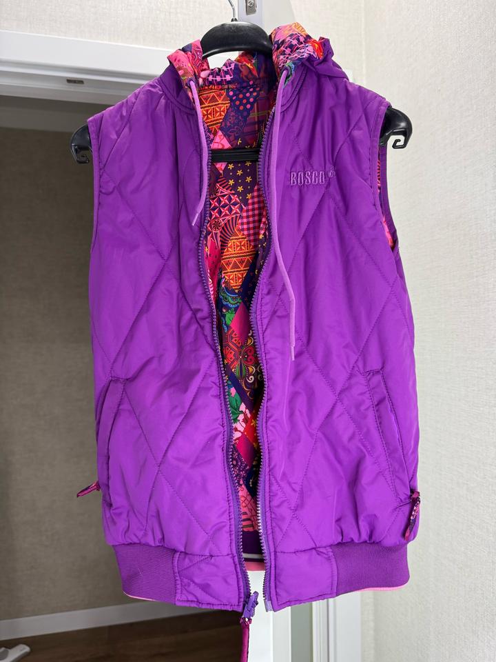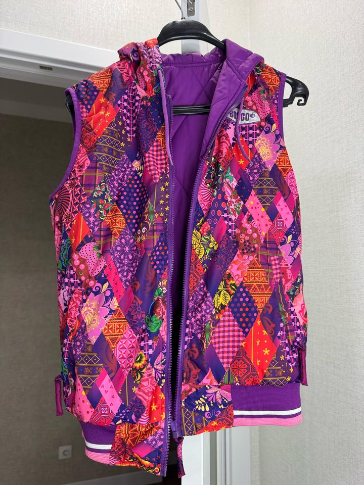 Безрукавка двухсторонняя Цвет приятный фиолетовый В отличном состоянии Бренд отшивали для олимпиады в россии, оригинальная и очень практичная На размер С и М Подросткам классно на ростовку от 155 Две стороны, карманы, замок, капюшон Артикул: 536305