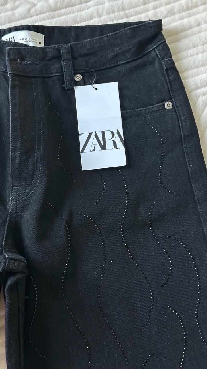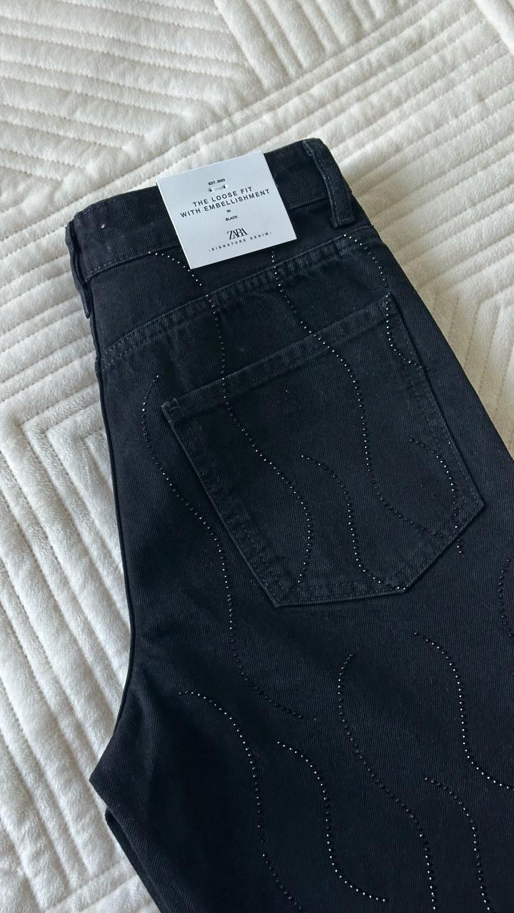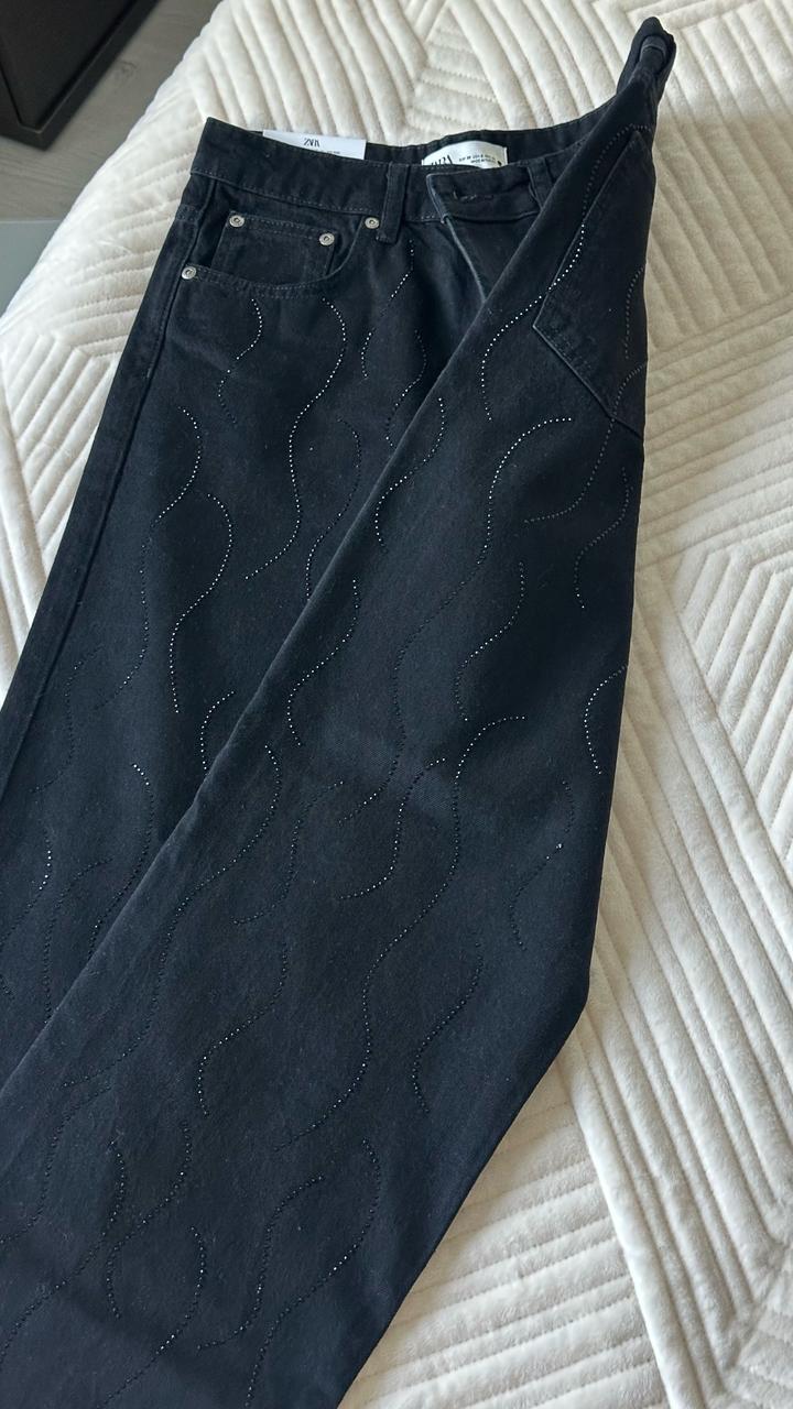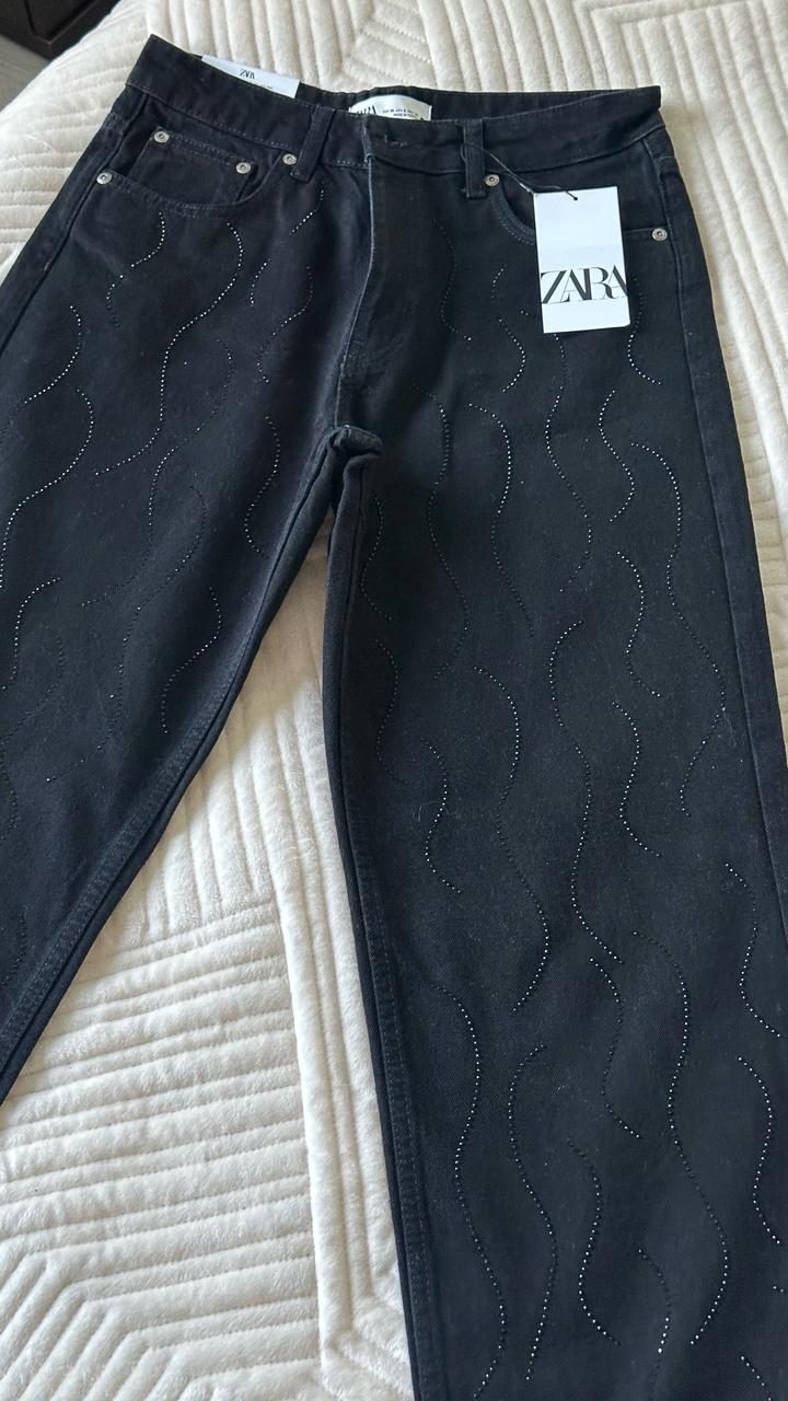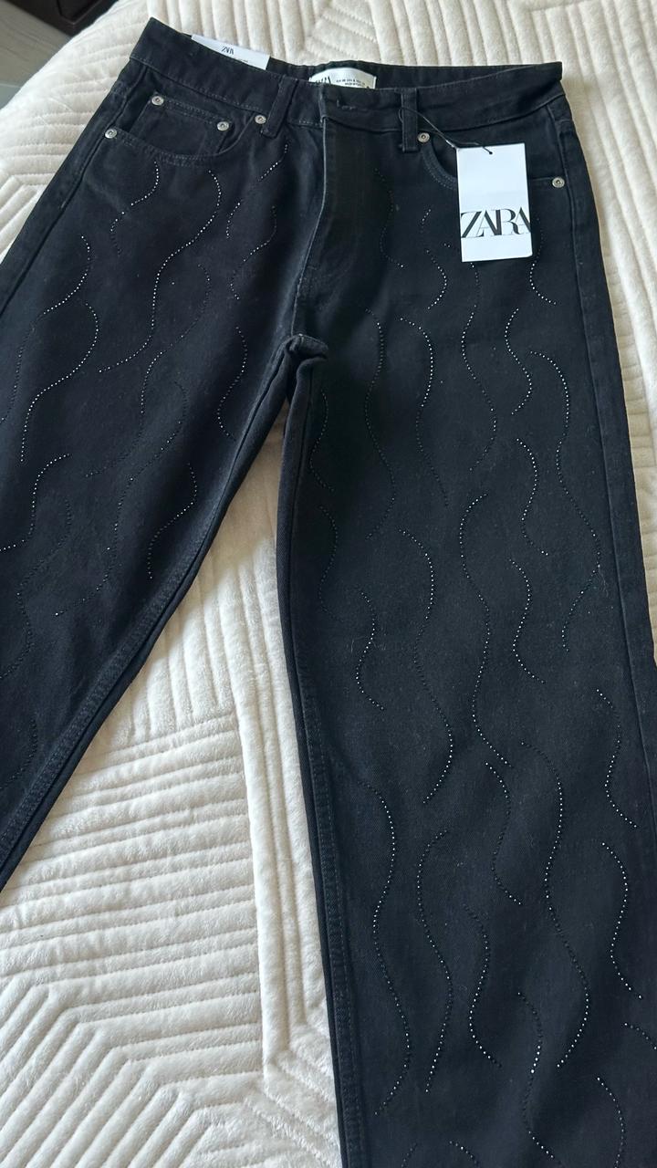 Шикарные прямые джинсы Зара с черными стразами Заказала с Португалии но размер не сел Камни по всей длине и спереди и сзади Отрываю от сердца ) Размер на С-М Этикетка на месте Артикул: 536493