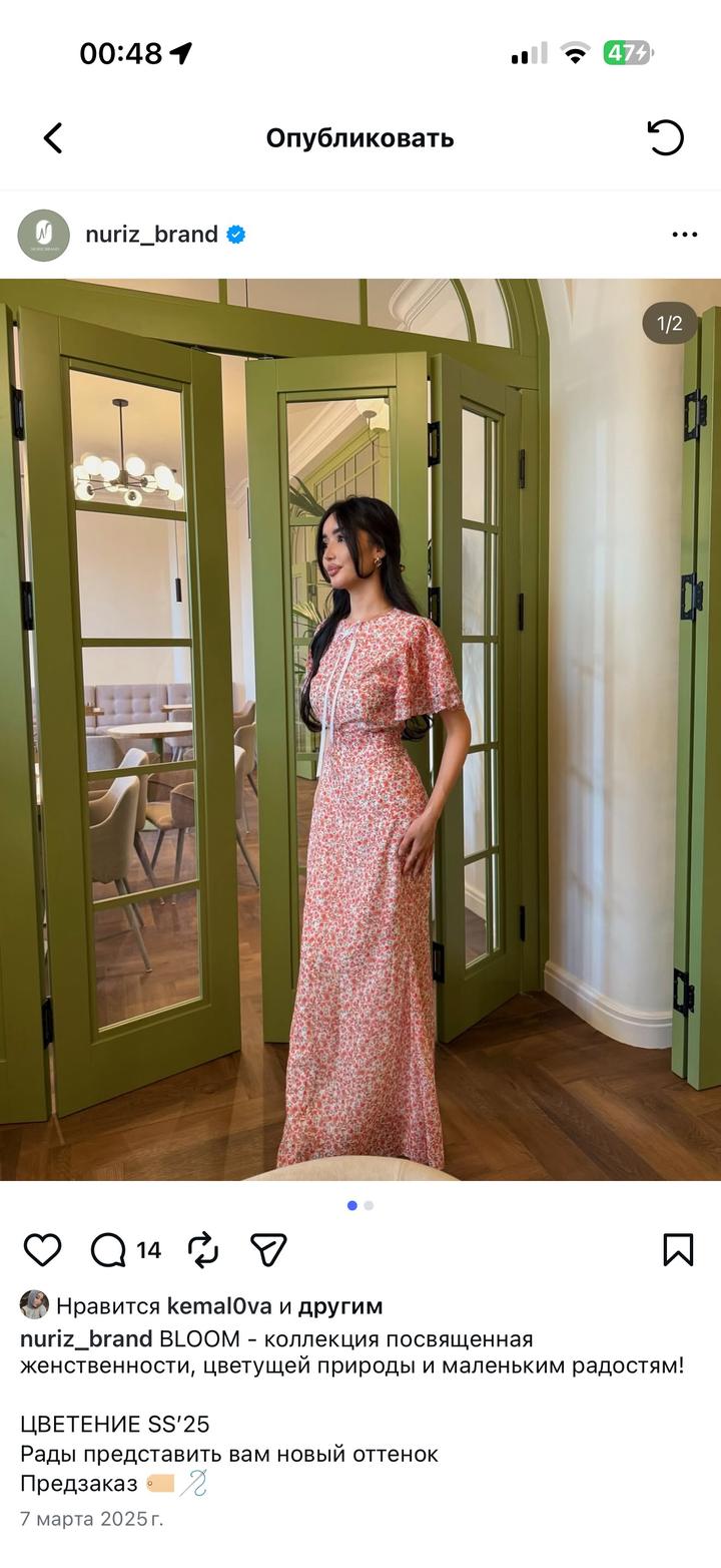 Платье от бренда Nuriz (ателье в Бишкеке) размер Xs , рост 160 +\- Надевала 1 раз Идеальное состояние Артикул: 536760