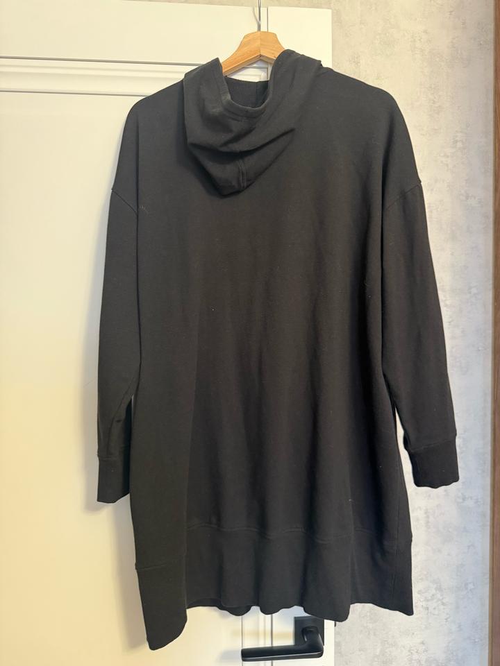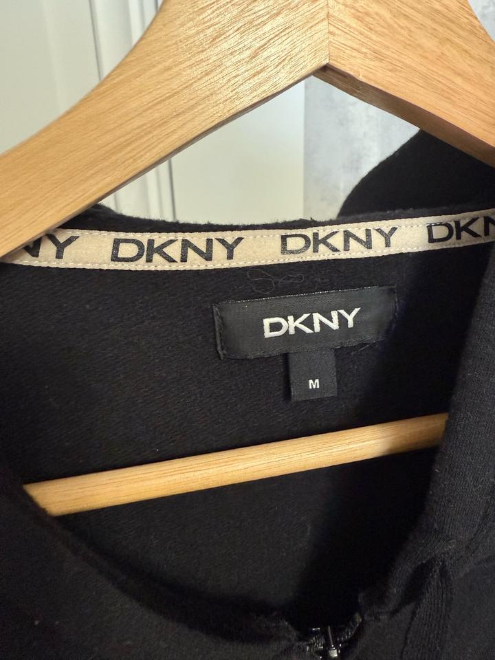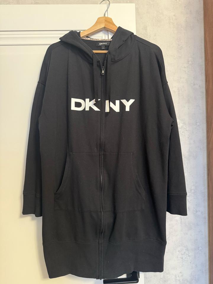 Черное женское худи с капюшоном от бренда DKNY. Оригинал. Б/у. В носке была немного. В отличном состоянии. Размер М/L. Свободная модель. Длина до колен, прикрывает ягодицы. Идеально подойдет для покрытой девушки. Артикул: 537101