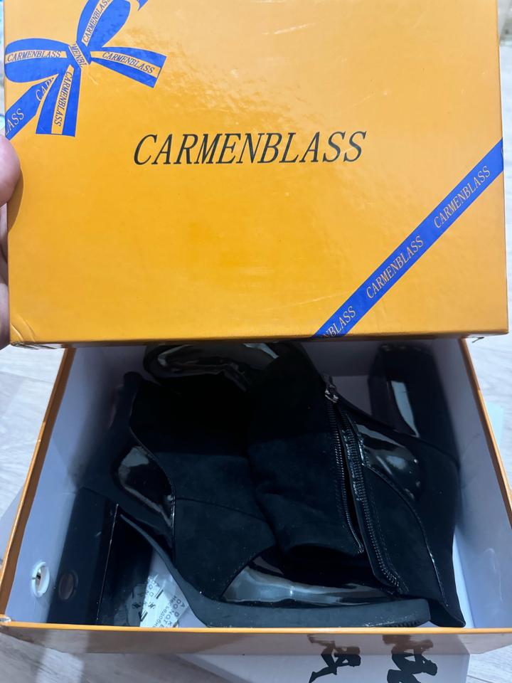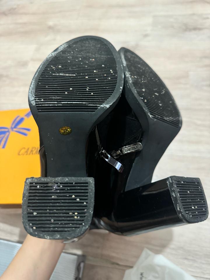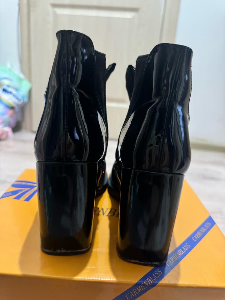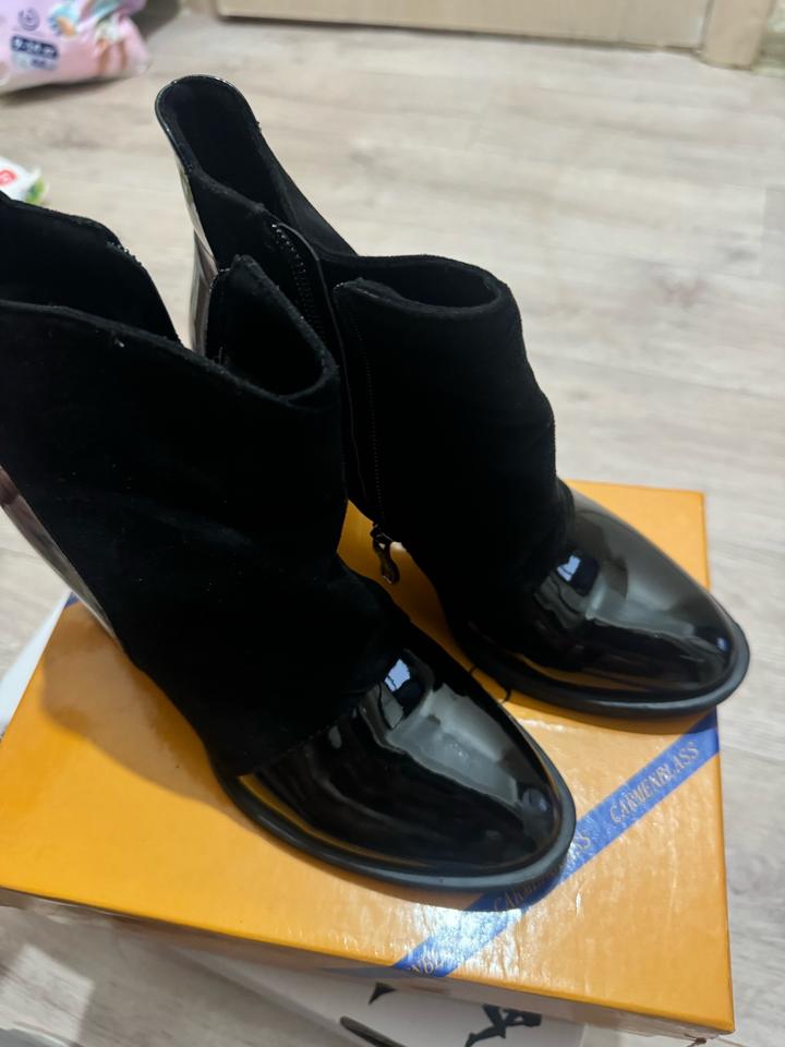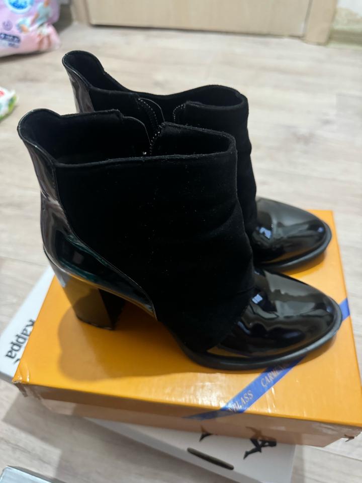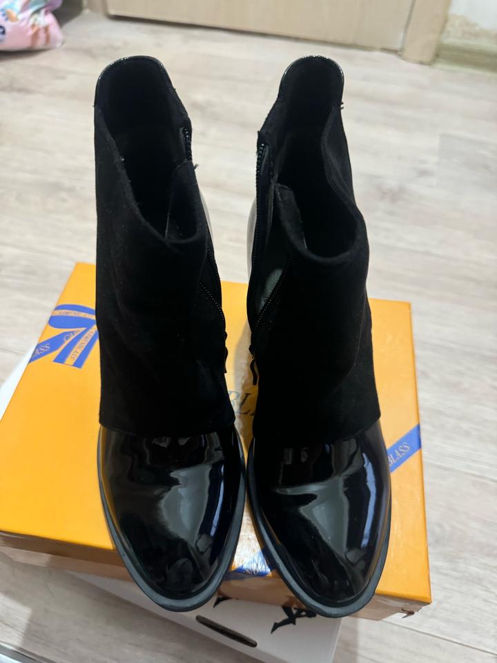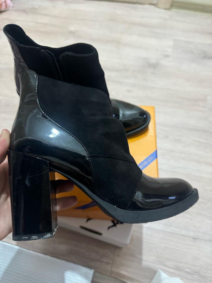 Черные ботинки бу, подойдет на 35-36 размер. Одевались пару раз на мероприятия. В коробке, в отличном состоянии. Материал лакированная экокожа+ замша. Дефектов нет. Каблук 7-8 см, удобная колодка. Артикул: 537127