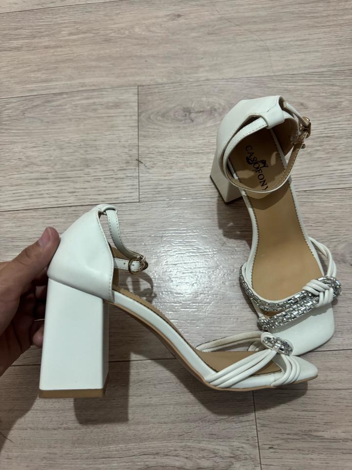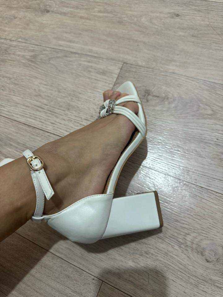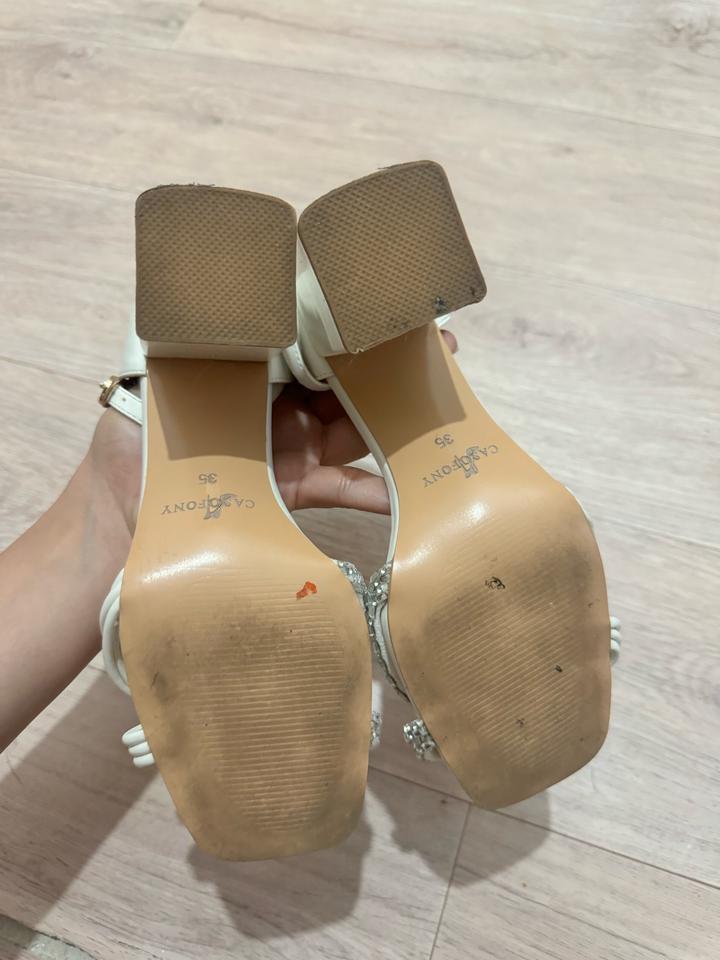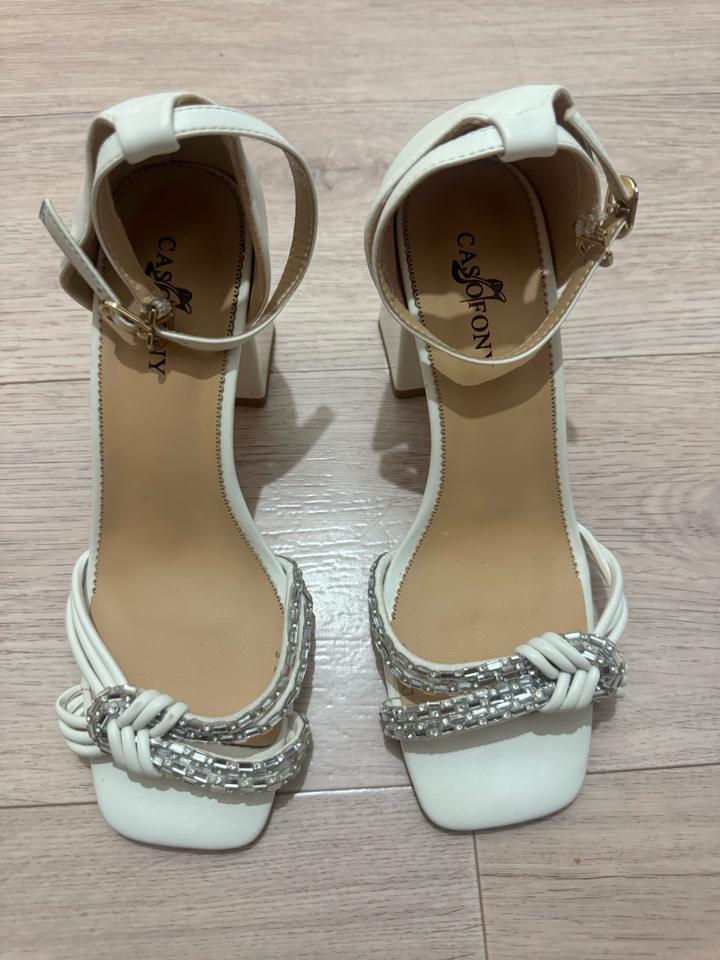 Белые босоножки почти как новые, одевались 2 раза на мероприятия. Состояние отличное, хранились в коробке. Стразы все на месте, дефектов нет. Очень удобная колодка, каблук 7-8 см. Артикул: 537135
