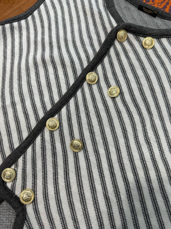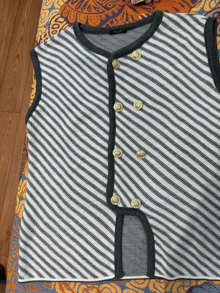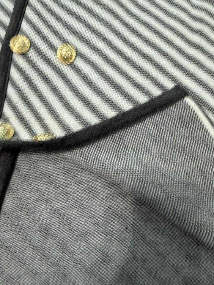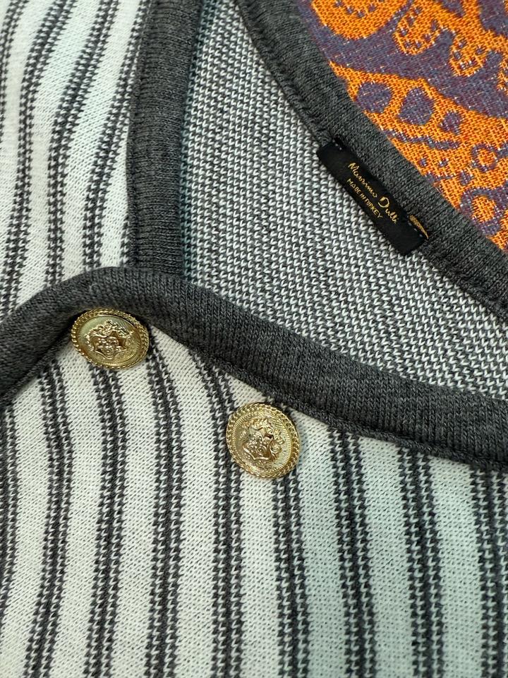 Жилетка в стиле Massimo Dutti Цвет: серо-белый в полоску Материал: плотный трикотаж Детали: золотые декоративные пуговицы, контрастная окантовка Посадка: прямой силуэт, комфортный крой Состояние: отличное Особенности: выглядит дорого и аккуратно, легко сочетается с базовым гардеробом Идеально подходит для повседневных образов, офиса или прогулок Артикул: 537371
