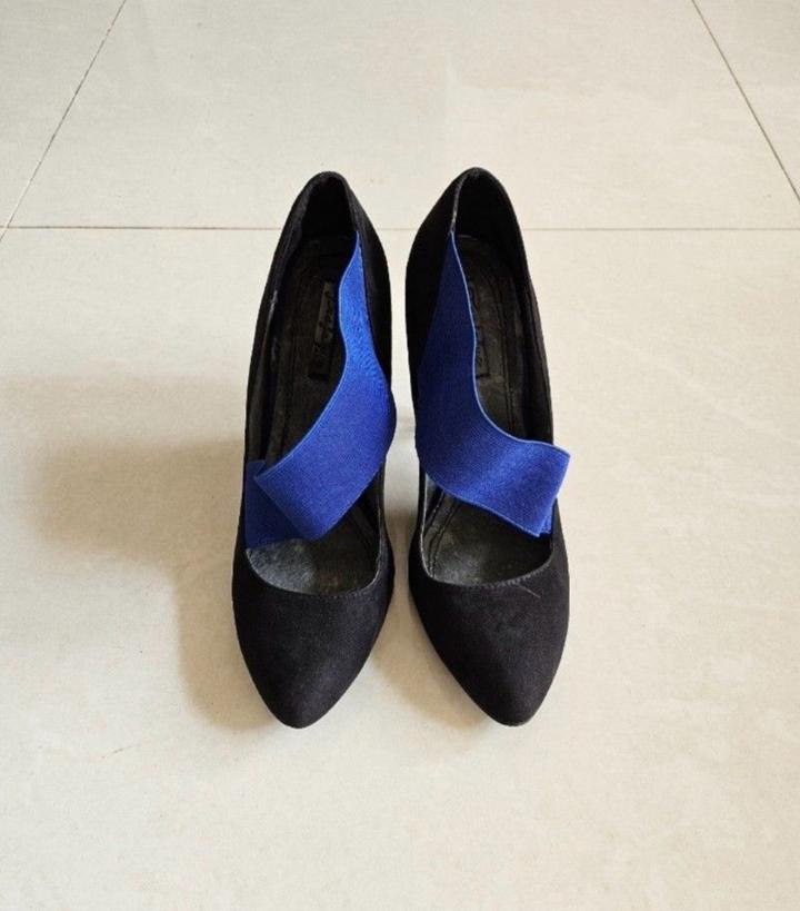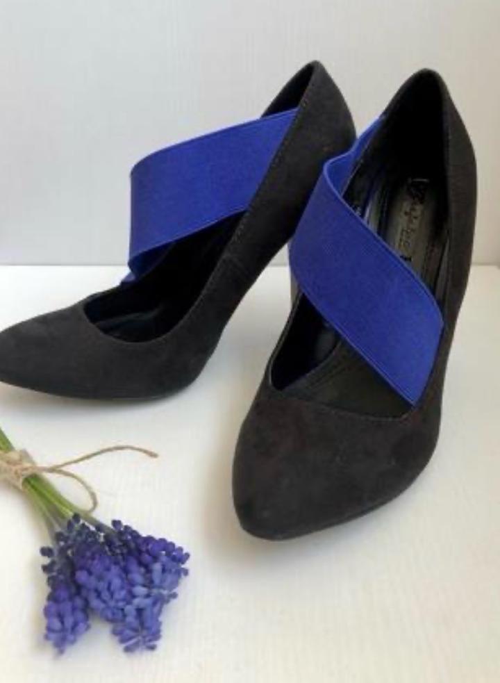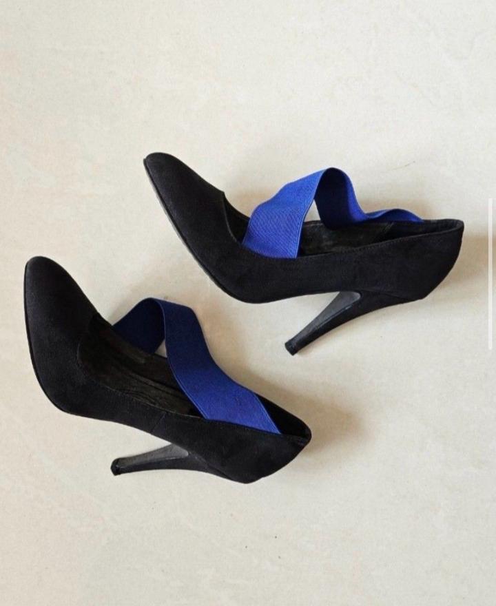 Практически новые — надевались всего один раз. Классический чёрный цвет, текстура «под замш», элегантная форма. Яркая синяя резиночка добавляет современный акцент и делает образ необычным. Удобные, стильные и универсальные — идеально под платье или джинсы. Артикул: 537625
