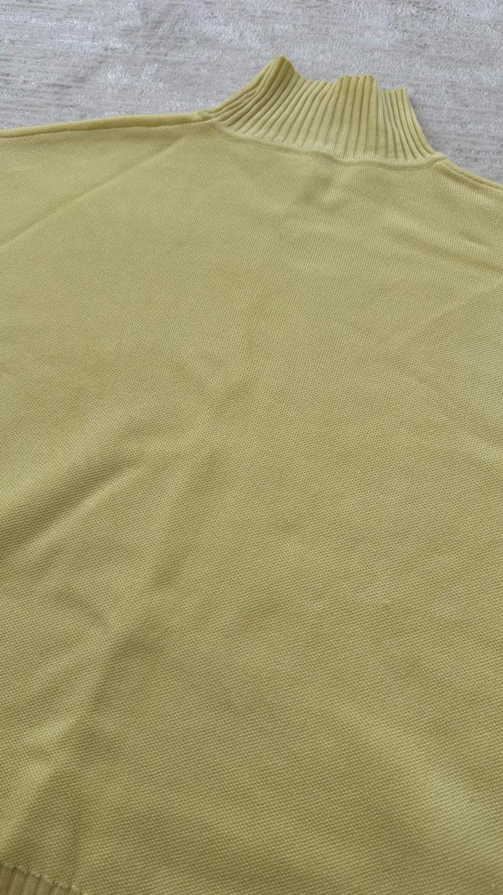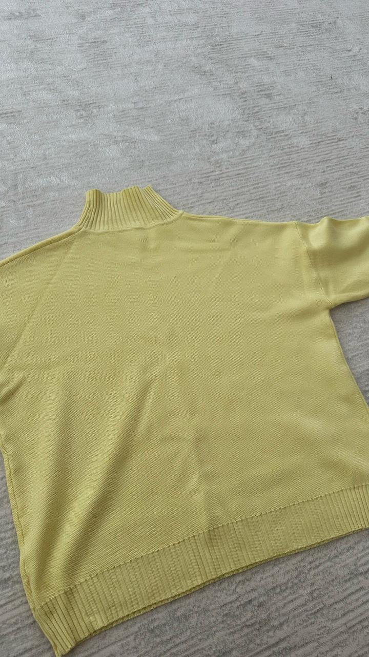 Продам тонкий трикотажный свитер с воротником-стойкой. цвет — светло-жёлтый / пастельный лайм • фасон — свободный, немного oversize • ворот — стойка • материал визуально — гладкий тонкий трикотаж, вероятно смесовый: вискоза / полиэстер / акрил Артикул: 537672