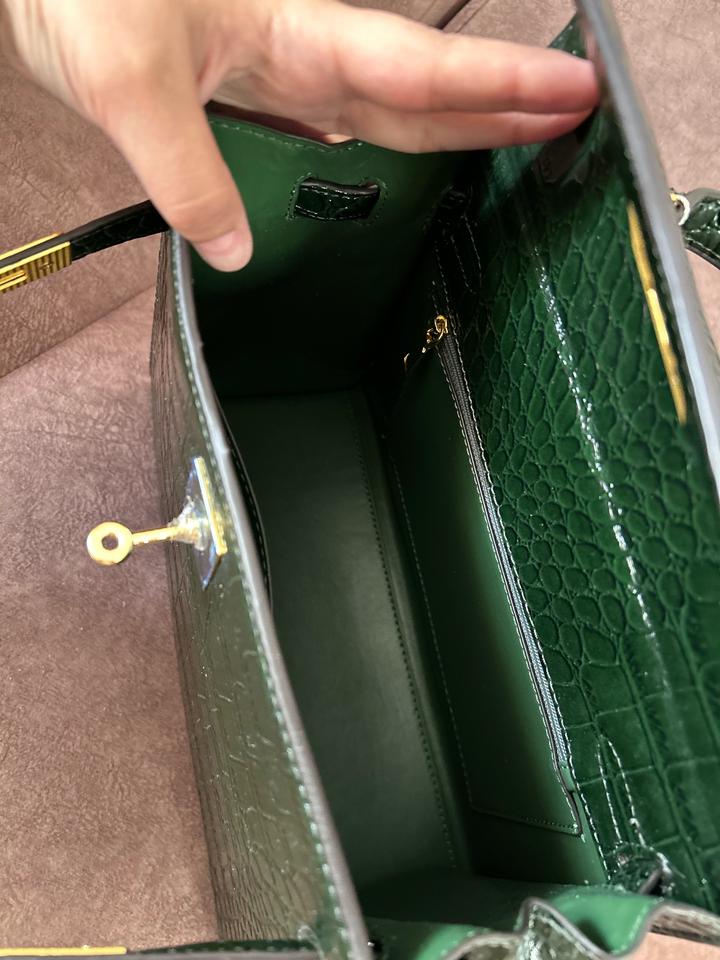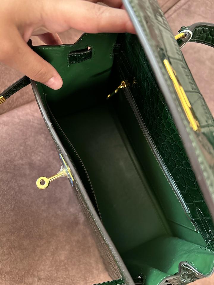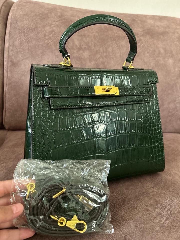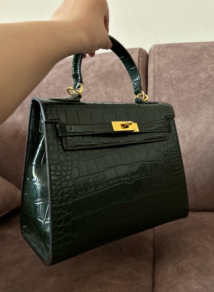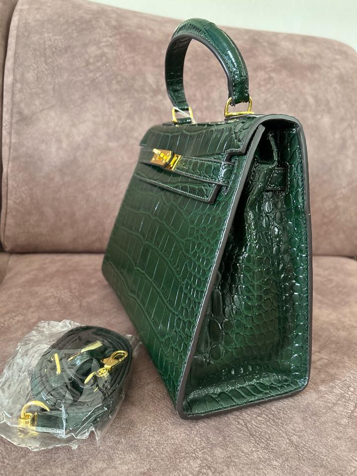 кожа, қанық жасыл түсті. Ұсталмаған, біраз уақыт тұрып шаң болып қалған. Көшу барысында, ұстайтын жерінде кішкене сызылып қалған жері бар. Ал былай жаңа. Крокодил терісінен жасалған Артикул: 538250
