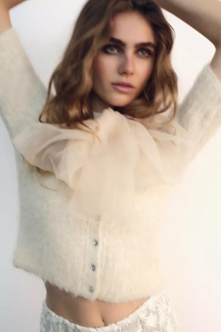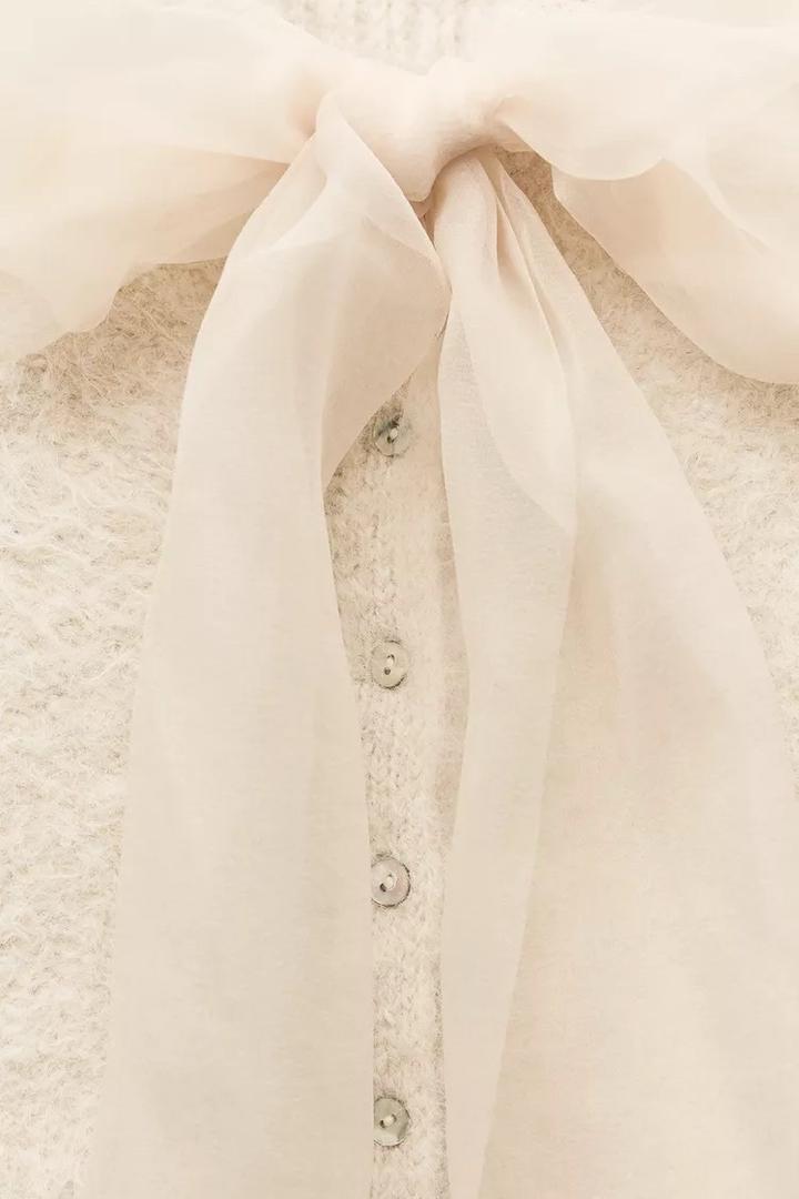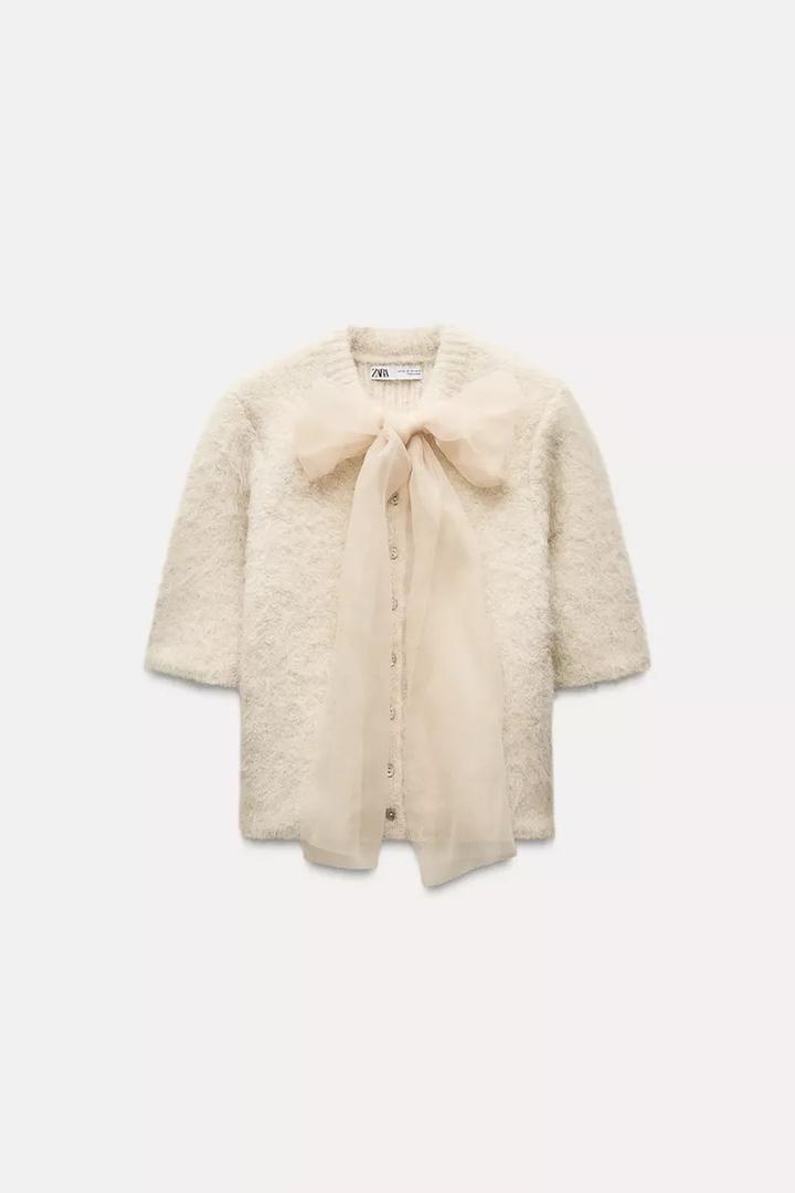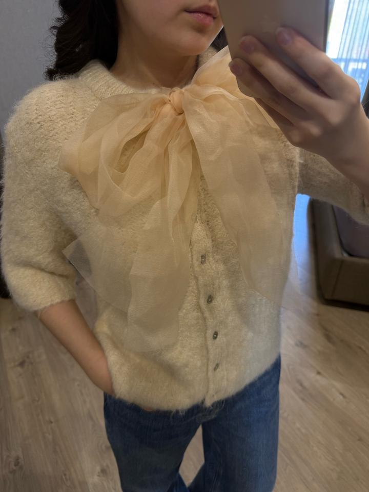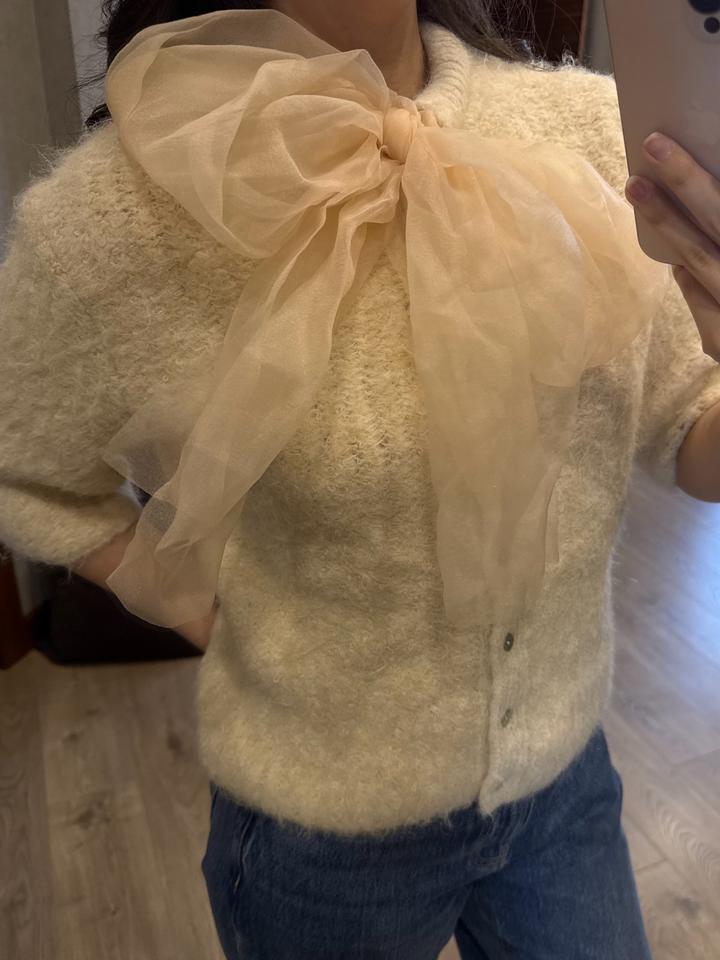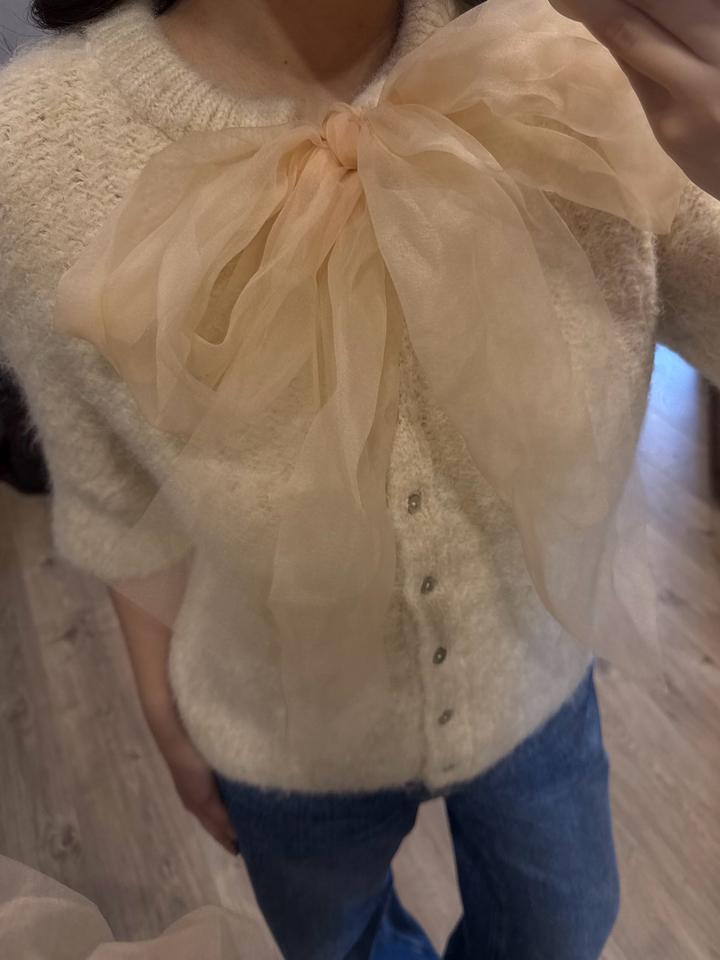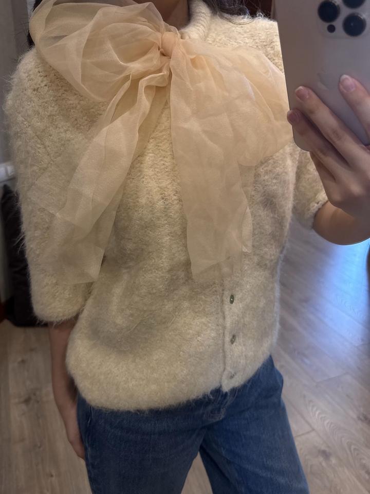 Топ с круглым вырезом и короткими рукавами. Контрастный бант из органзы. Застегивается на пуговицы. Размер XL, но он маломерит. Артикул: 538334