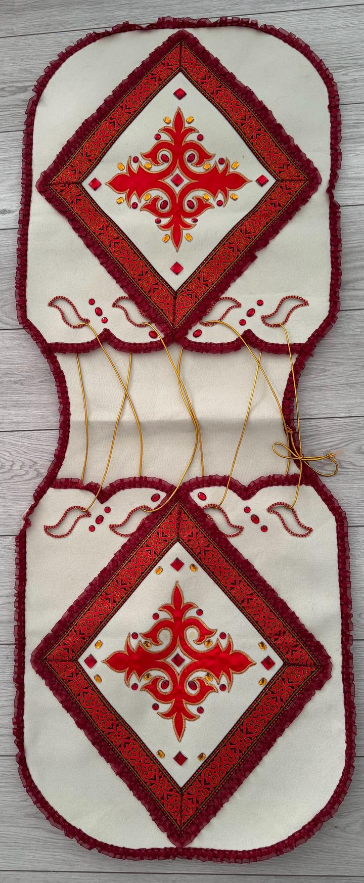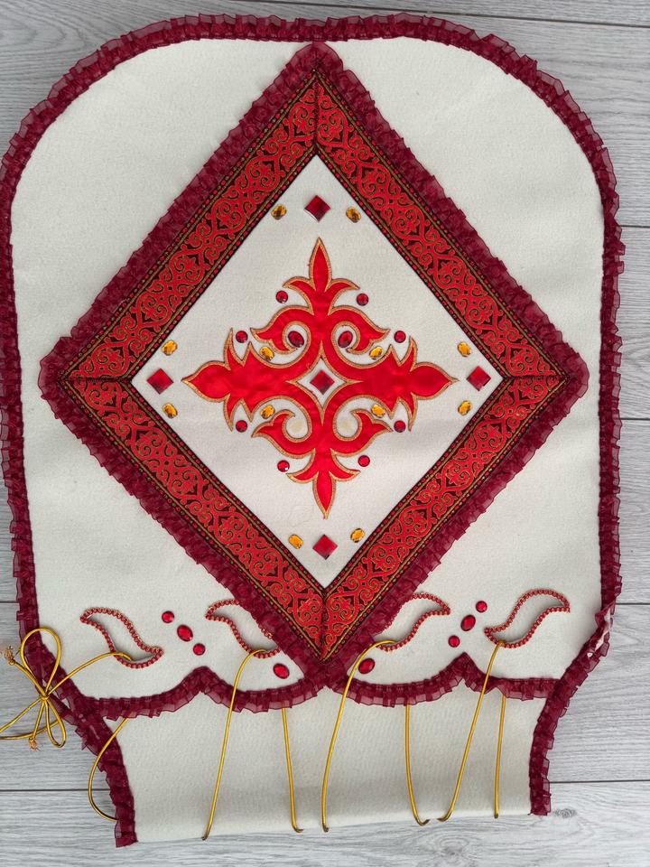 Эксклюзивный коржын с богатым казахским орнаментом Изысканное сочетание красного и золотого — символ достатка и счастья Идеально для: — қыз ұзату — беташар — свадебных подарков — оформления той ✔ Объёмный, плотный материал ✔ Красивая декоративная отделка (камни, тесьма) ✔ Смотрится дорого и празднично ✔ Подходит для фото и традиционных обрядов “Подходит для приданого и подарков — смотрится очень дорого” Артикул: 538431