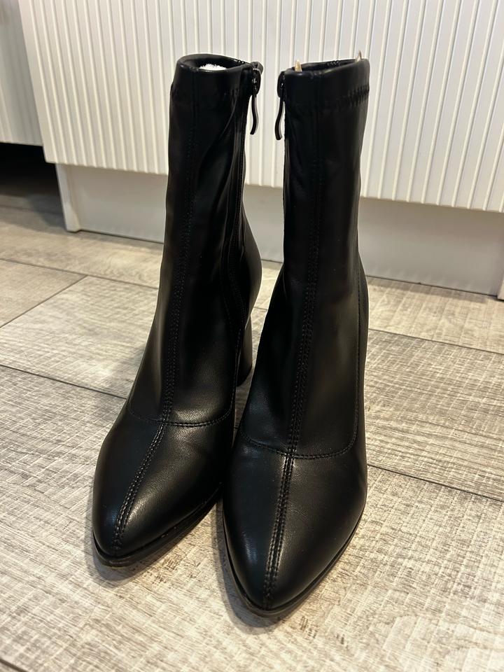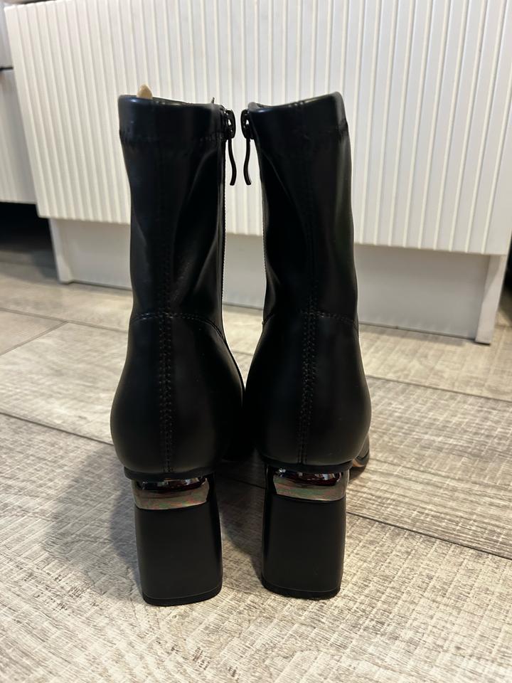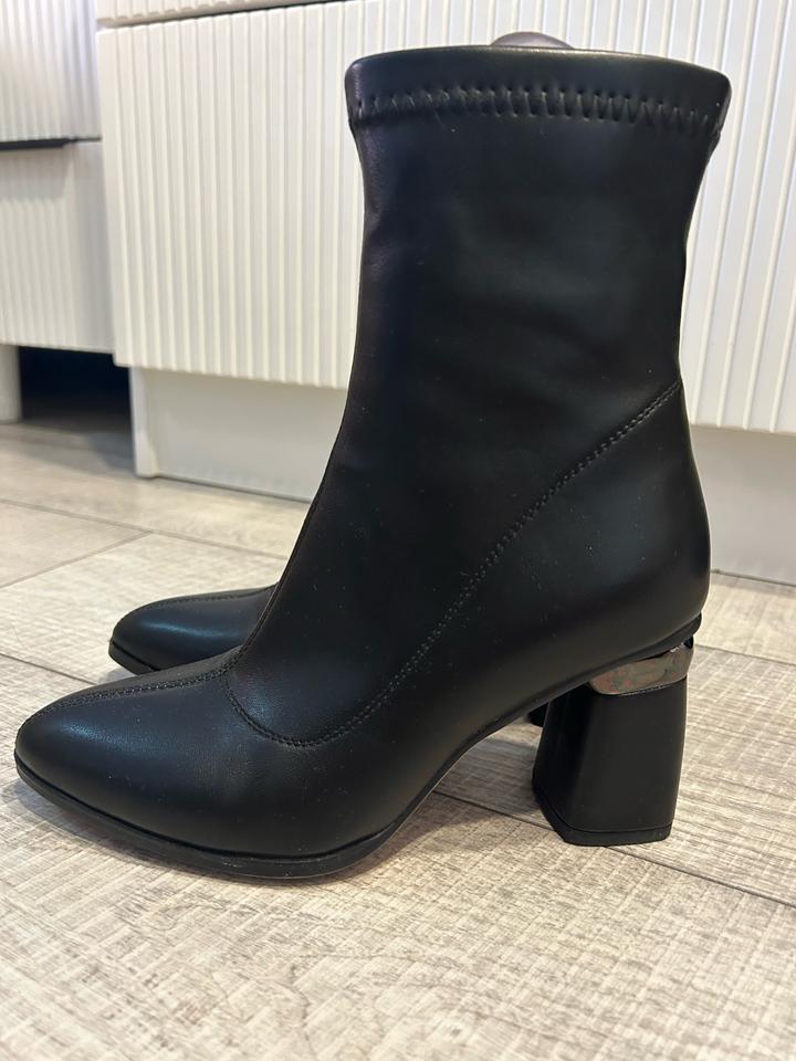 Стильные черные ботильоны из эко-кожи на квадратном каблуке с металлической вставкой и узким носком. Отличное состояние. Размер 37, заказывали онлайн, не подошел размер. Артикул: 538519