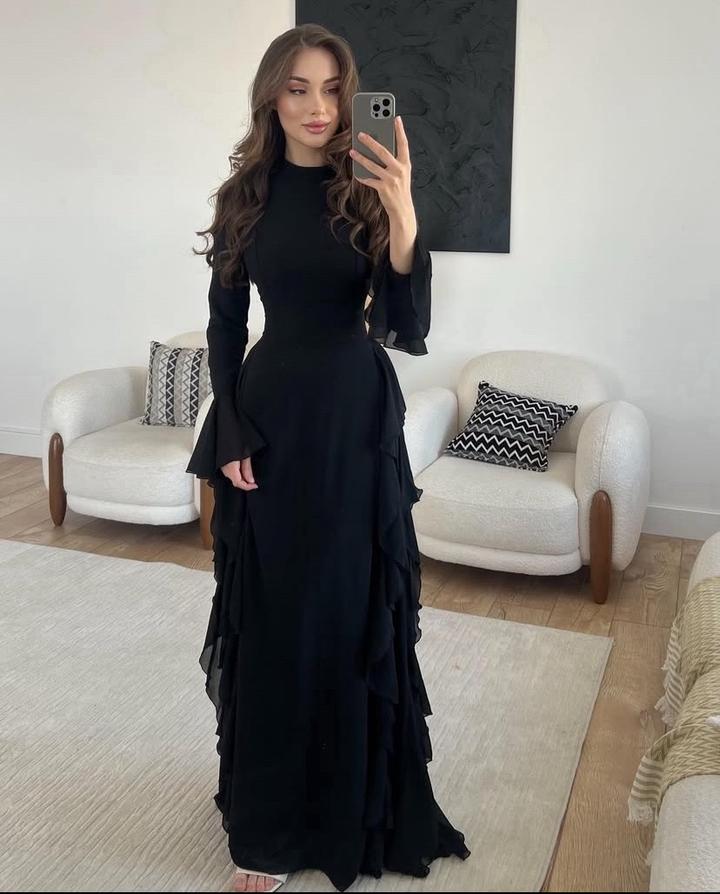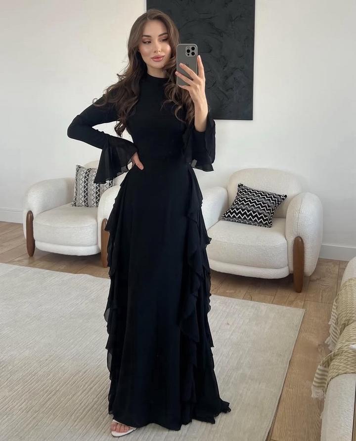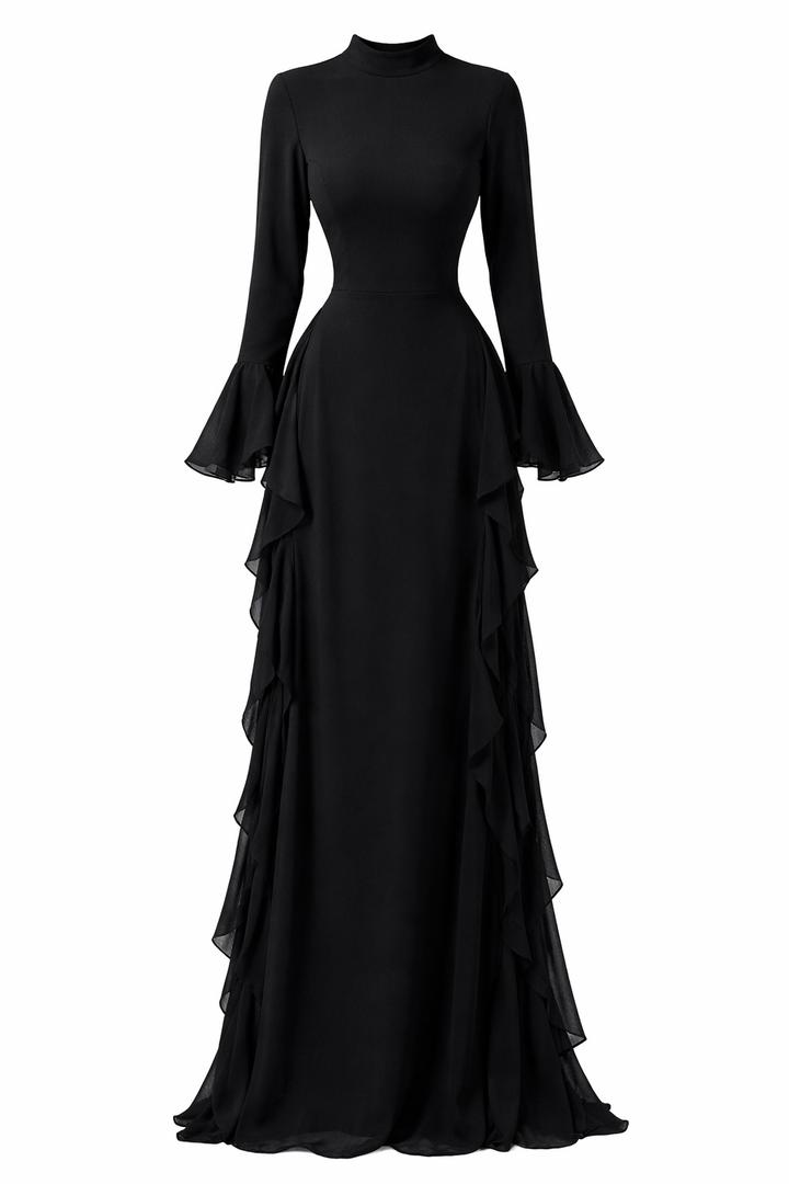 Элегантное длинное платье из хлопка, в черном цвете для вечерних мероприятии. Модель выполнена в облегающем силуэте, который подчёркивает фигуру и создаёт утончённый образ. Верх закрытый, с аккуратным высоким воротом и длинными рукавами с лёгкими расклёшенными манжетами, добавляющими изящества. Юбка в пол украшена каскадными рюшами по бокам, что придаёт платью динамику и визуальную лёгкость при движении. Артикул: 538620