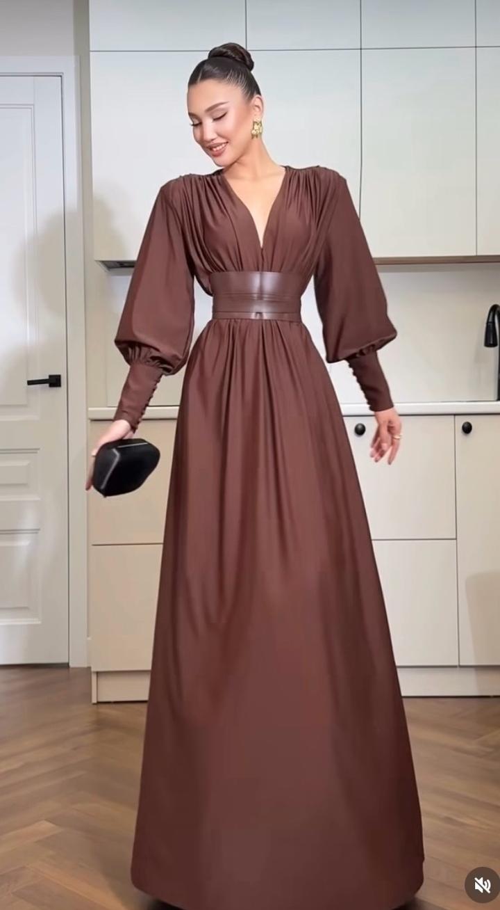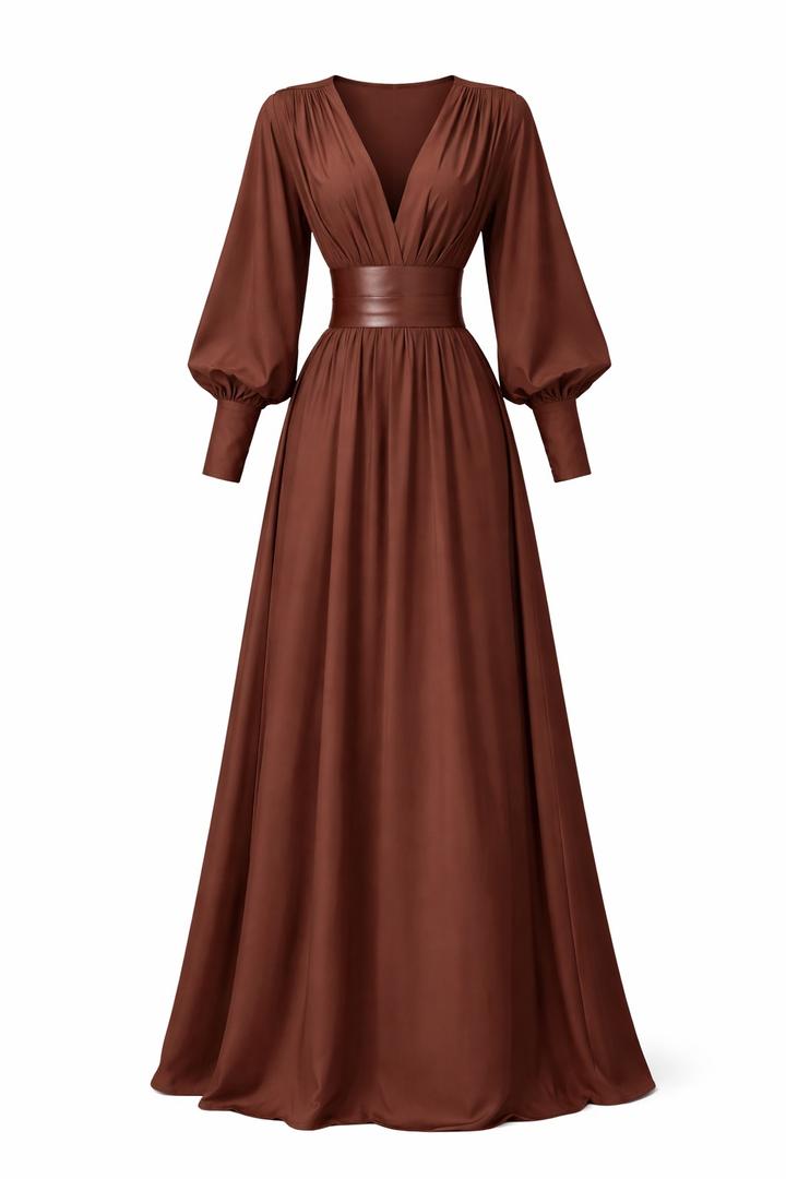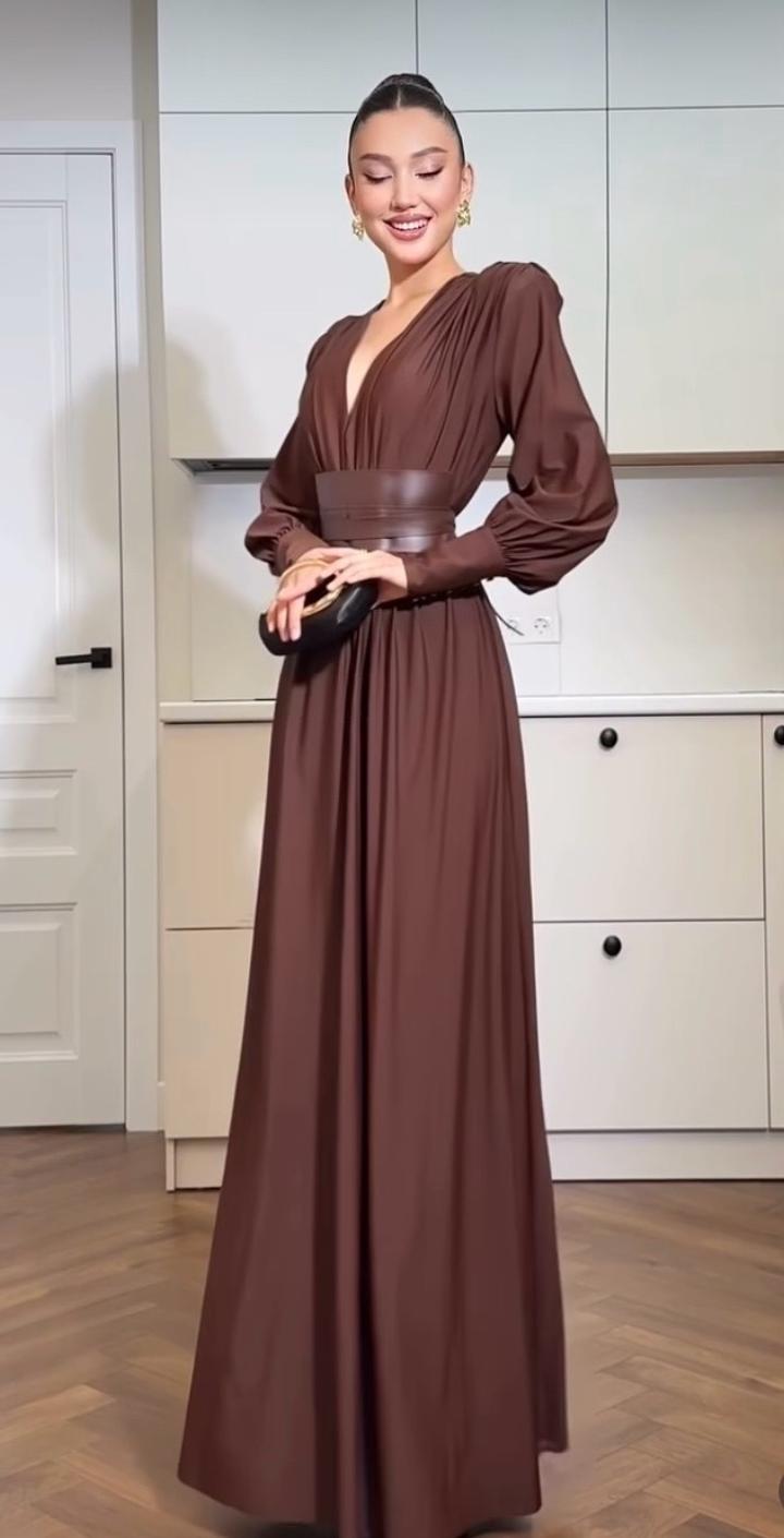 Стильное вечернее платье в благородном холодном шоколадном оттенке — идеальный выбор для элегантных образов и особых случаев. Модель выполнена в длине макси с акцентом на талию: широкий пояс подчёркивает силуэт и создаёт эффект “песочных часов”. Глубокий V-образный вырез визуально вытягивает линию шеи, добавляя образу утончённости. Объёмные рукава с манжетами придают платью выразительность и современный характер. Артикул: 538654