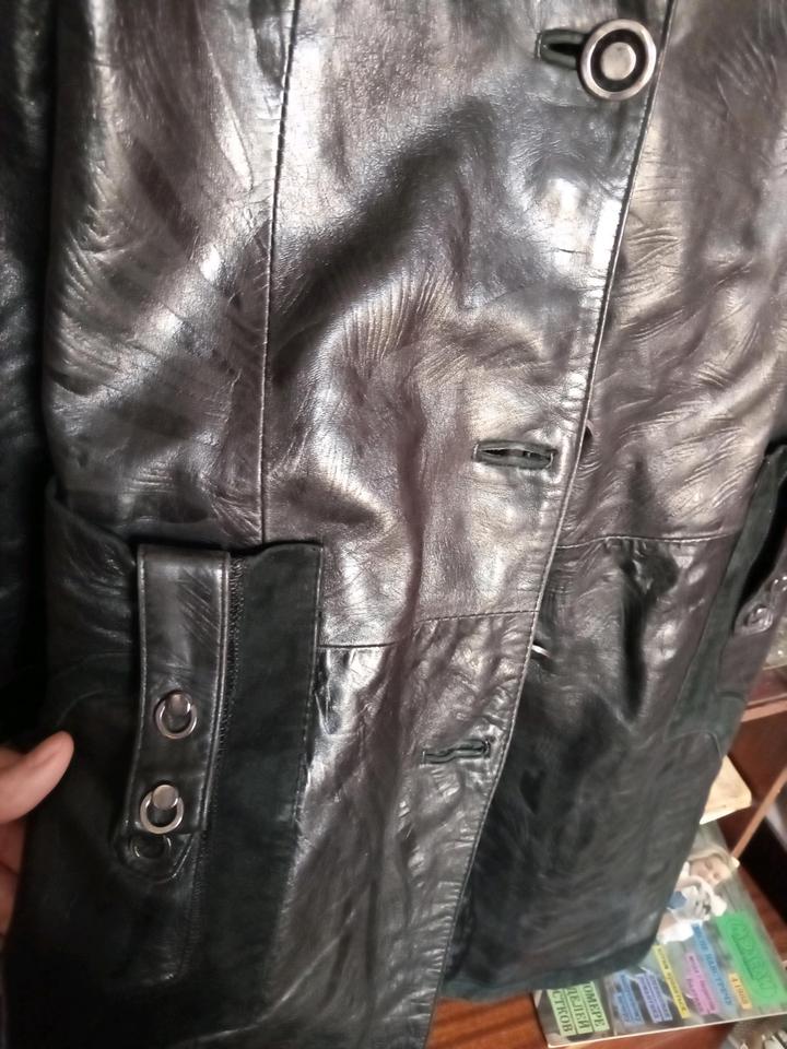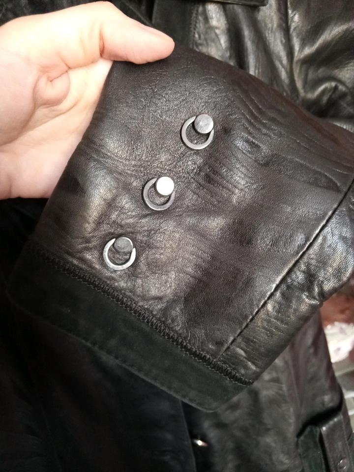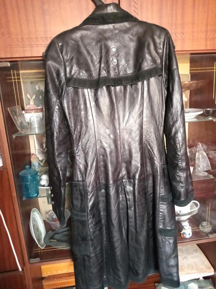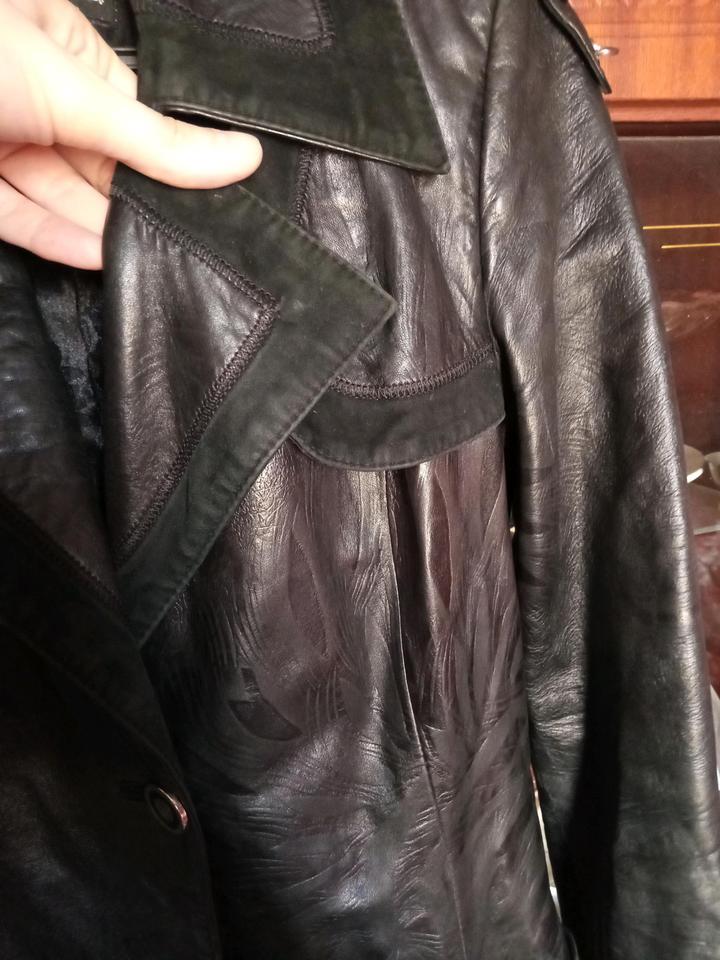 Черный плащ из кожи с замшевой отделкой. В хорошем состоянии, но надо погладить Грудь 90 см Талия 76 см Длина 100 см Длина рукавов 60 см Артикул: 538657