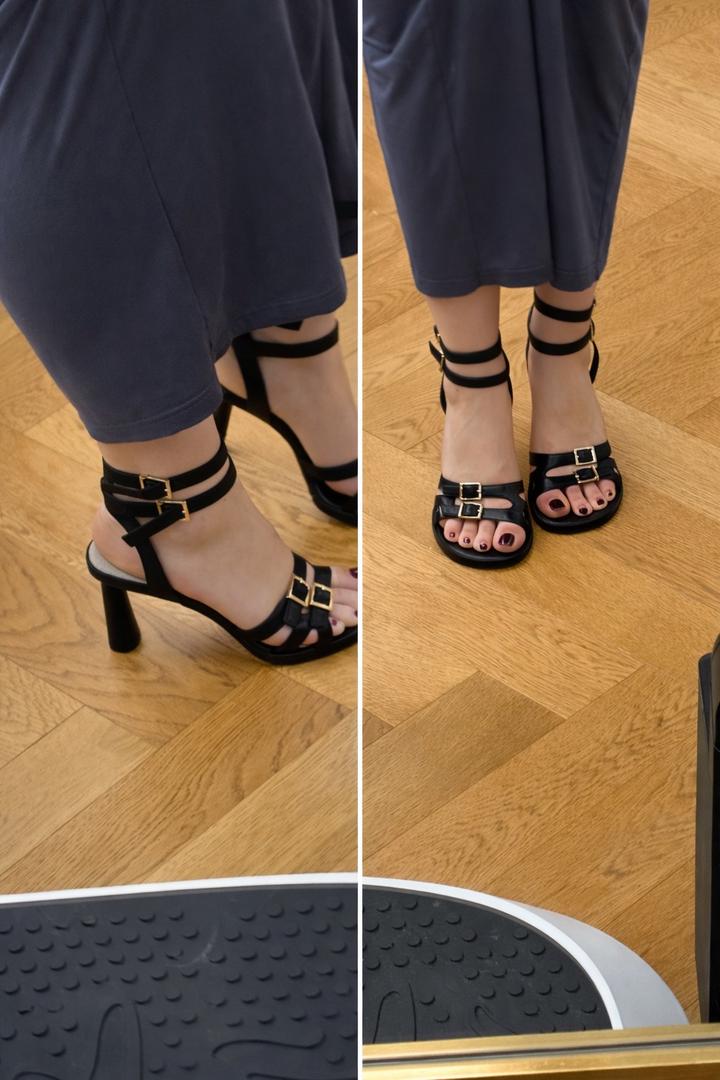 Босоножки на круглом, более устойчивом каблуке. Открытый нос, закругленная форма. Черный цвет, с золотыми «пряжками», и с черной окантовкой вокруг щиколоток. Очень удобная колодка, каблук 6см. Артикул: 538787