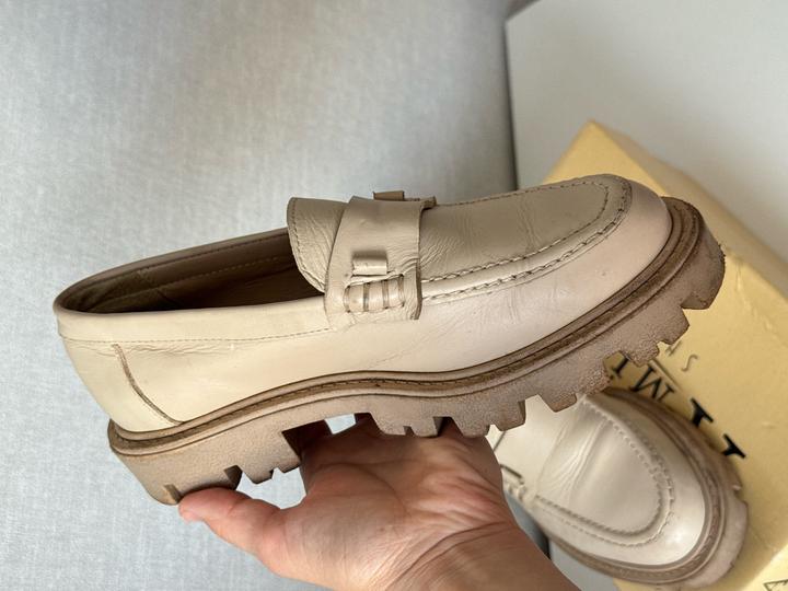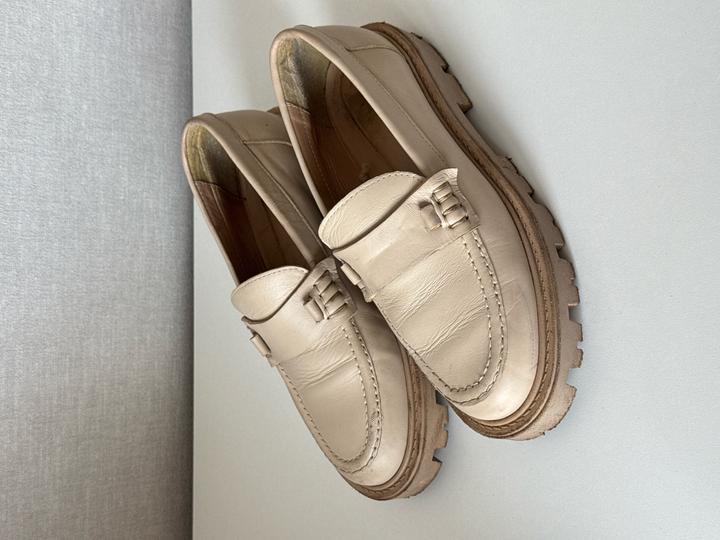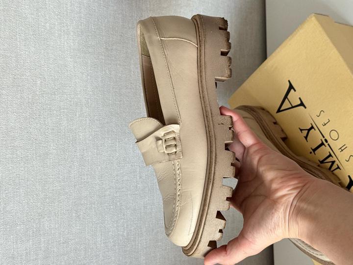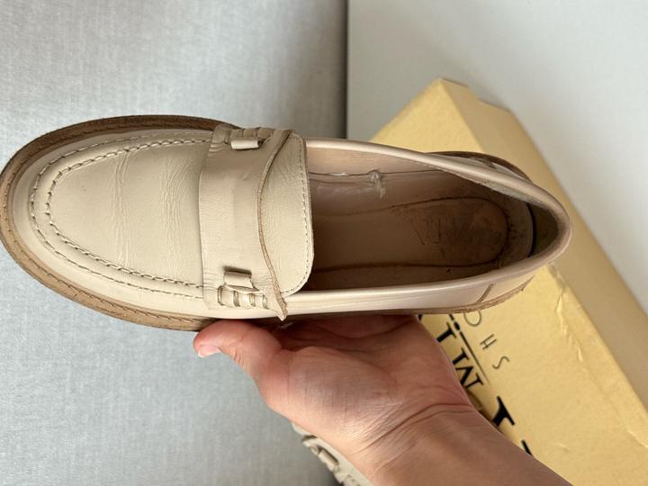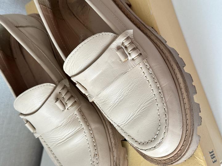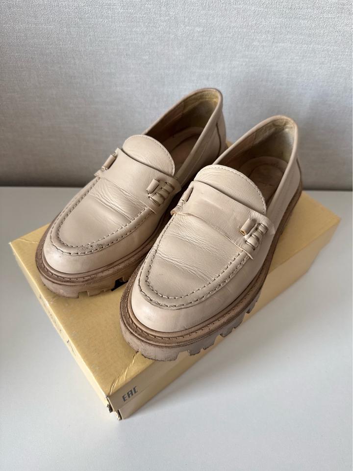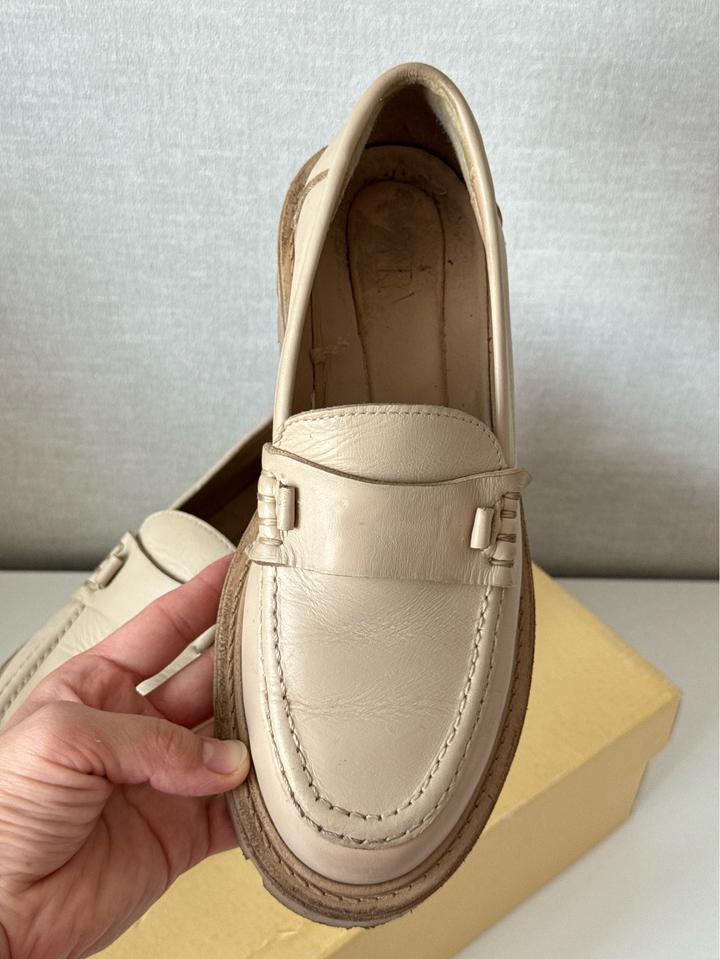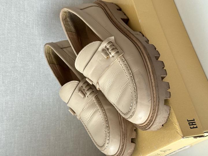 Бежевые лоферы от бренда Zara. Была золотая трензель, только в одной паре. Так и продавалось в магазине, и была на скидке. Размер 36. Артикул: 539001