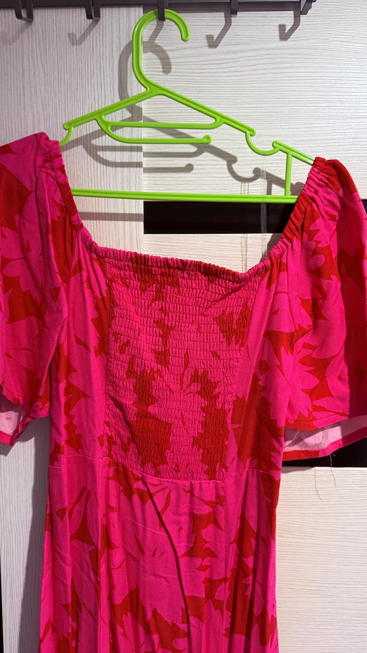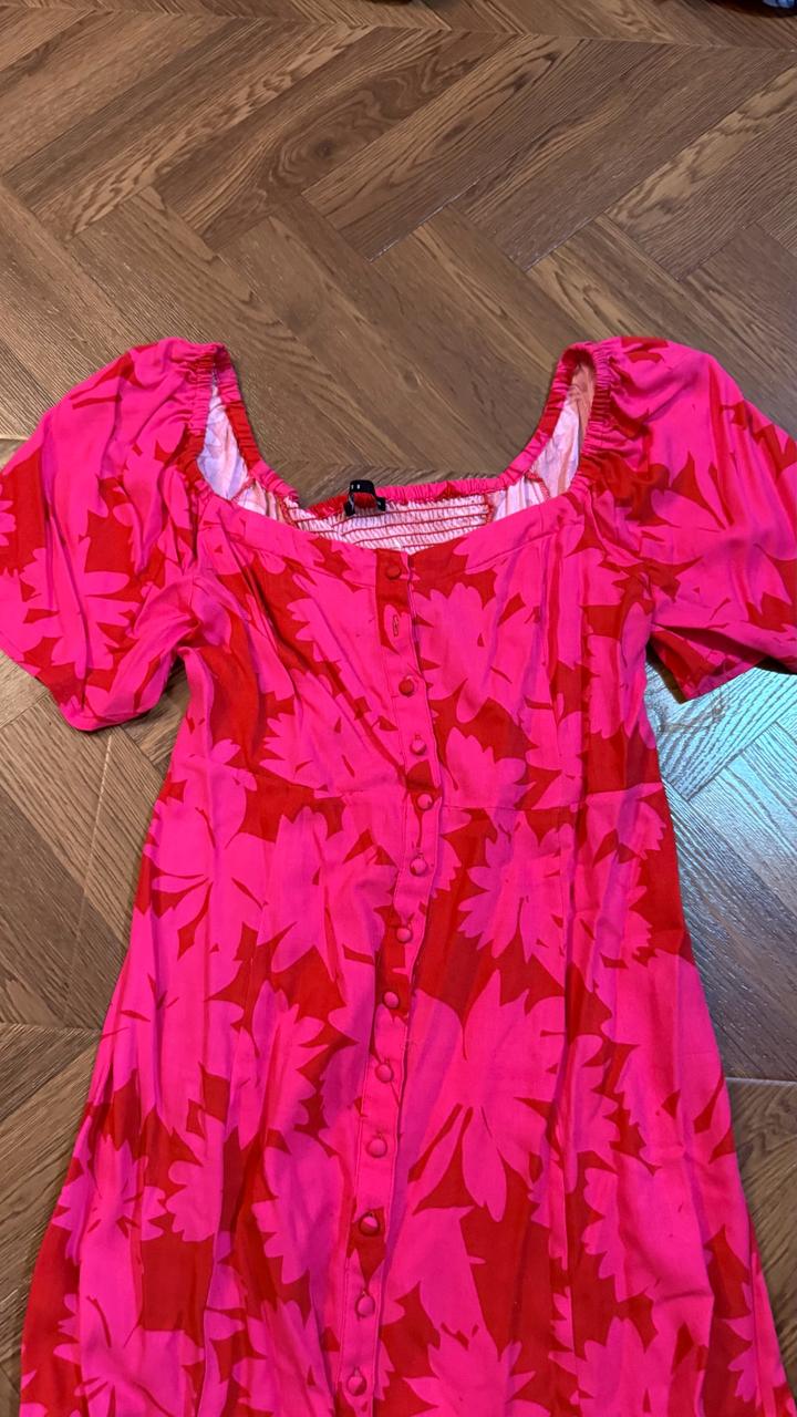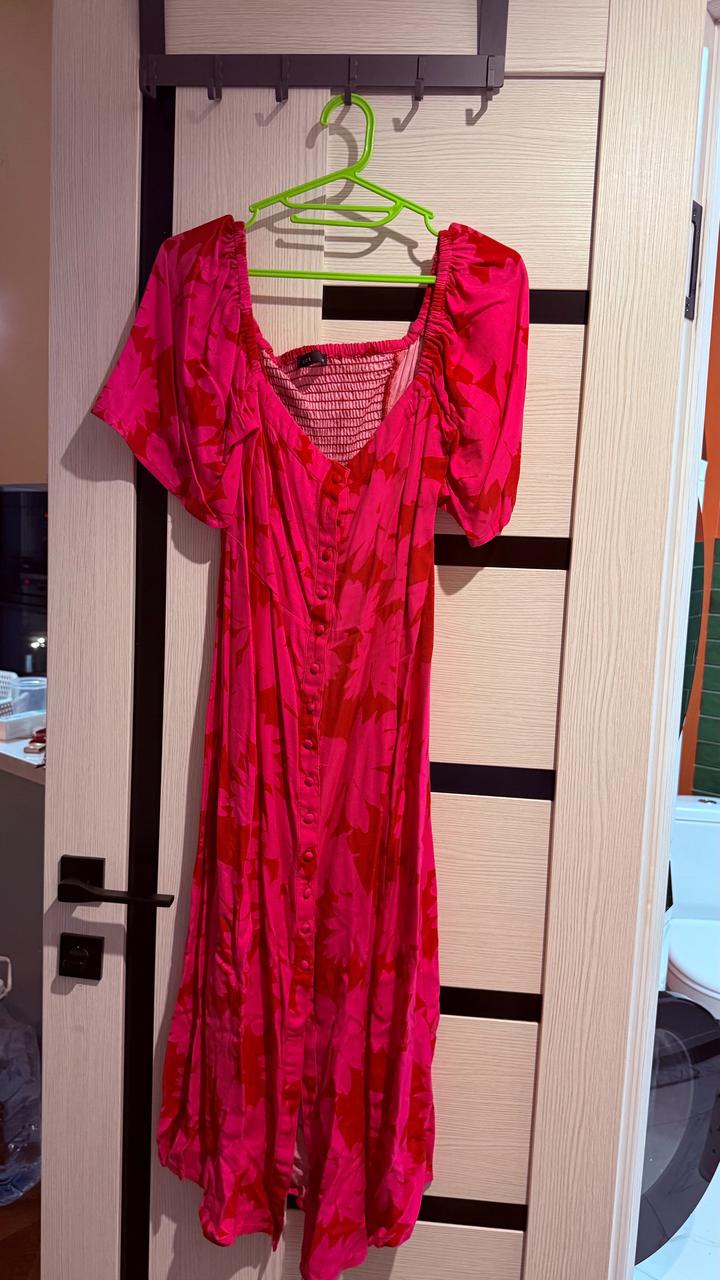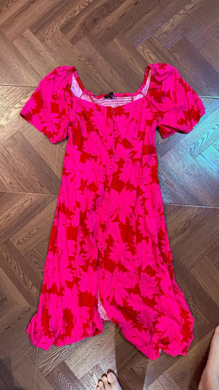 Лёгкое и женственное платье ниже колена. Яркий цветочный принт, отлично подойдёт на лето 🌸 — Материал: 100% вискоза (дышащая, приятная к телу) — Длина: миди (ниже колен) — Рукава: короткие, свободные/фонарики — Спинка: на резинке (хорошо тянется, комфортная посадка) — Застёжка: пуговицы спереди по всей длине, рабочие — Вырез: аккуратный квадратный — Силуэт: приталенный, красиво подчёркивает фигуру Артикул: 539029