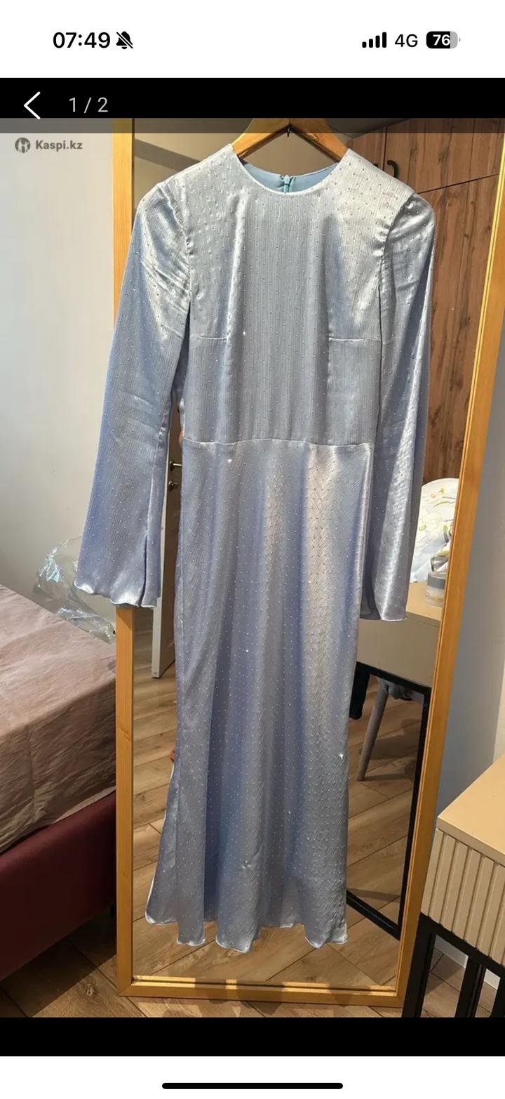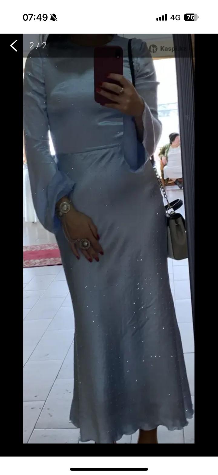 Платье в длине миди с мерцающими стразами в нежном небесном оттенке . Изделие выполнено из итальянского шелка. Надевалось один раз на мероприятие, размер С платье абсолютно новое, после химчистки. очень благородный цвет🥹 красиво блестит, нежное Артикул: 539343